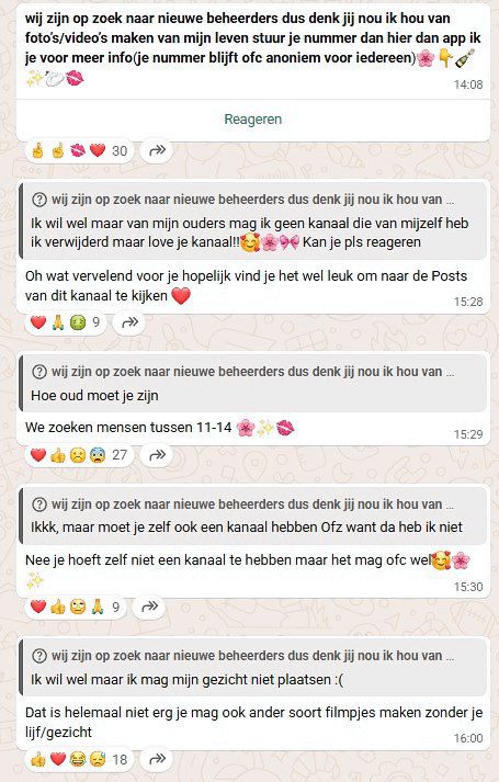 ‘Hotties’ (knappe meisjes) die ‘lippies’ (lipsync video’s) maken in ‘kpt’ (kapot) leuke ‘meidenhuizen’. Het zijn veelgebruikte woorden onder tienermeiden die berichtenapp WhatsApp gebruiken om berichten te posten die voor iedereen leesbaar zijn. Zo’n kanaal, een ‘meidenhuis’, is een nieuwe vorm van online interactie die sinds ongeveer een week door sociale media-experts wordt opgemerkt. De berichten die meiden plaatsen maken hen kwetsbaar voor online (seksueel) misbruik, waarschuwen deze experts.
