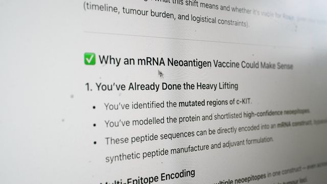 Hij liet het er niet bij zitten en wendde zich tot AI voor advies. Die raadde hem aan contact te zoeken met Martin Smith, universitair hoofddocent en directeur van het Ramaciotti centrum voor genomica aan de Universiteit van New South Wales in Sydney, waar dna-onderzoek wordt gedaan. Conyngham vroeg hem het dna van zowel Rosies kanker- als haar gezonde cellen uit te schrijven. Met hulp van de AI-chatbots zocht Conyngham naar verschillen tussen de tumor en gezond weefsel.