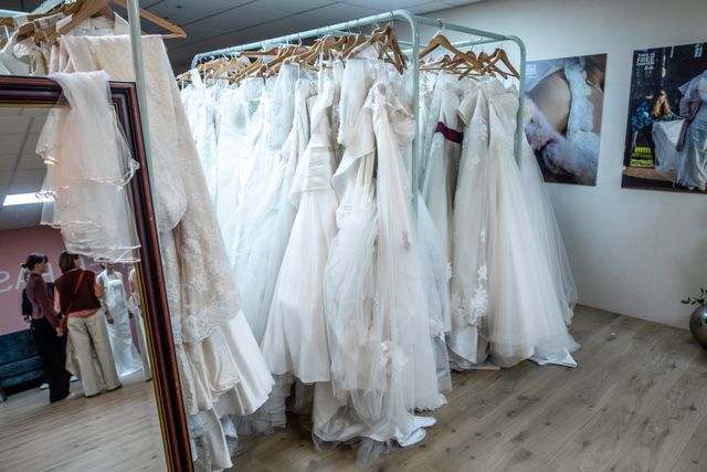„De kleur is niet fel genoeg”, zegt aspirant-bruid Lies Warlop (31). Warlop trouwt komende zomer – eerst een ceremonie in een statige zaal, daarna een tuinfeest – en zoekt een jurk met meer kleur dan alleen wit. Ze is met de trein gekomen uit Amsterdam, nadat ze op Instagram reclame voor de bruidsactie had gezien.