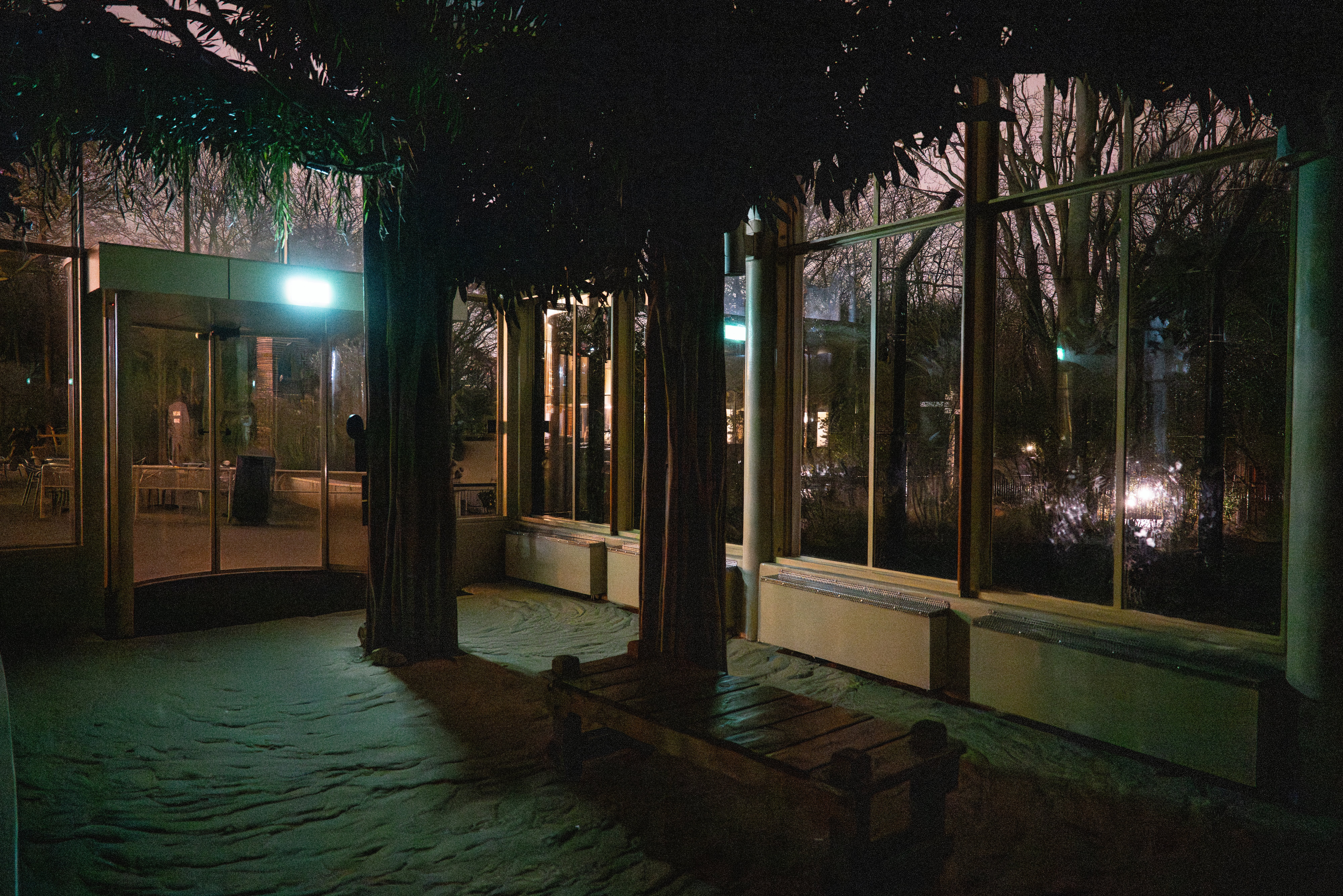 Tegenover de Aziatische olifanten ligt een Indische neushoorn te slapen. De maan schijnt door het dak van de grote kas waarin het Zuidoost-Aziatische landschap is nagebouwd: staal, glas en daaronder ‘bomen’ en ‘rotsen’. De geluiden van de jungle klinken ook ’s nachts door de boxen. Een deel van de vegetatie is echt. „Ze noemen het ook wel een botanische tuin met wat dieren erin.” Te midden van de decorstukken draait de neushoorn zich nog eens om.