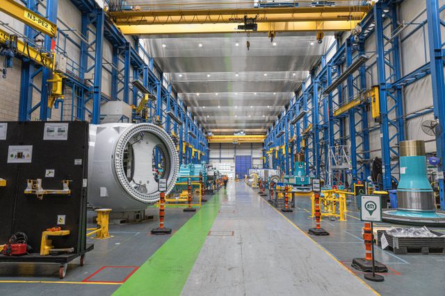 In de Vestas-fabriek klinkt Spaanse reggaeton uit de radio, gemixt met piepjes en gezoem uit de machines.