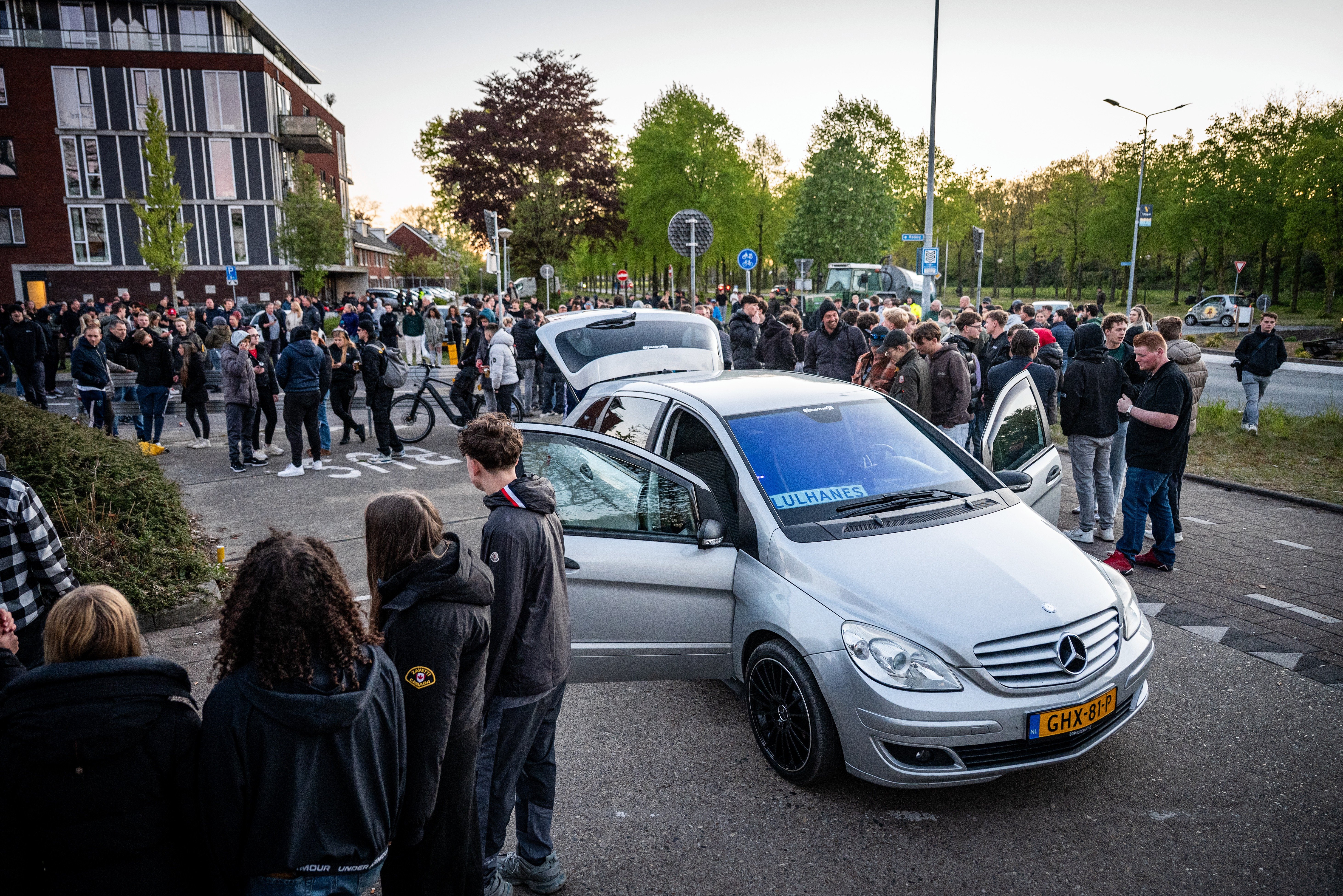 De politie blijkt deze donderdagavond veel minder zichtbaar aanwezig. Dit keer geen dranghekken en ME’ers in het gelid, wel een uit Utrecht overgekomen politieagent die zich urenlang al babbelend tussen de betogers mengt. Plus nog een geüniformeerde collega of drie. De sfeer is afwachtend, de groepjes betogers kijken vooral naar elkaar, tienerjongens naar de geroutineerde azc-betogers, meisjes naar de cameraploegen. Geroepen of gescandeerd wordt er weinig. Rond kwart voor negen komt er leven in de brouwerij: uit een auto geparkeerd naast de rotonde klinken pompende beats uit een indrukwekkende geluidsinstallatie. De song is een paar dagen geleden opgenomen, glimlacht een man bij de auto: