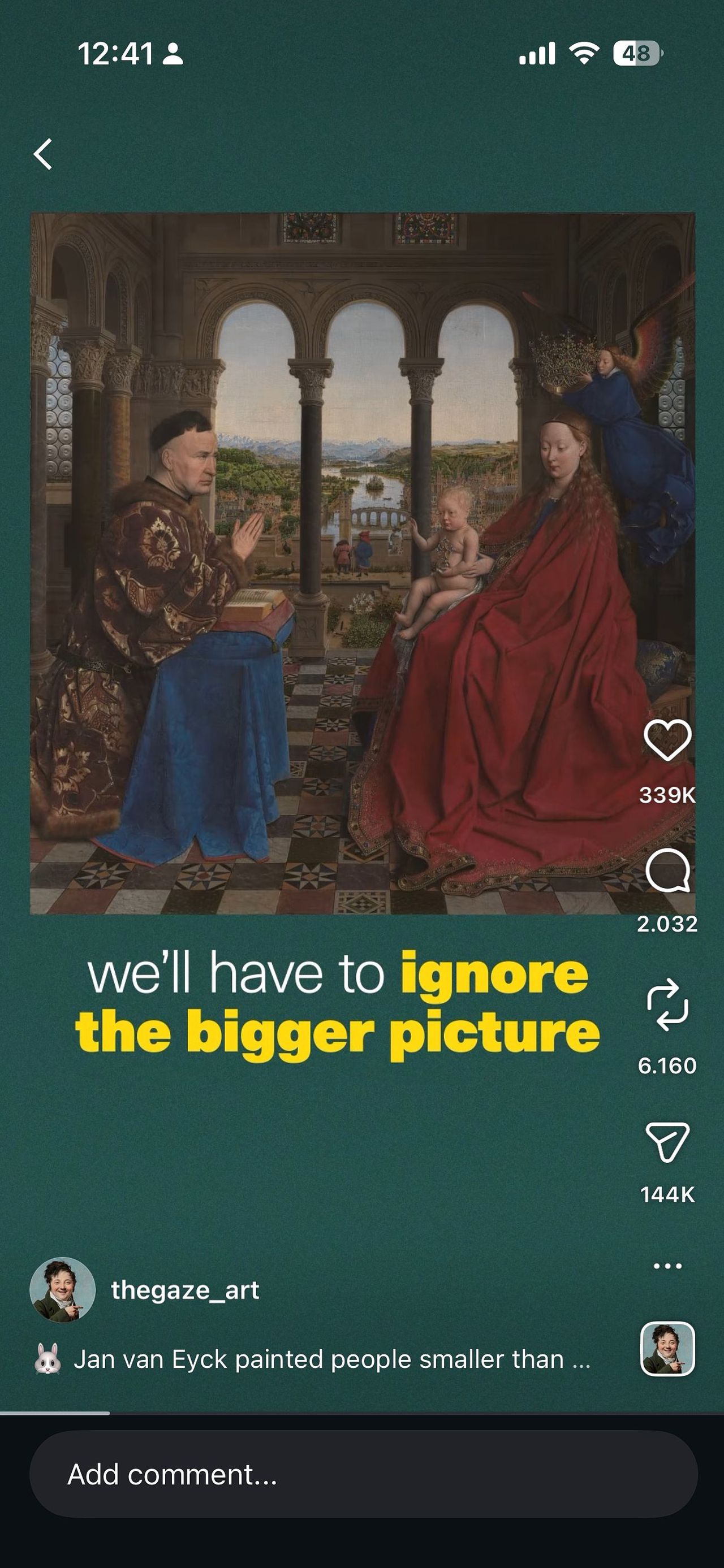 Screenshots van de Instagramfeed van The GazeJe aanpak is: via een grappig of bizar detail de kijker in een kunstwerk te trekken. Hoe kom je op je ideeën, zoals bijvoorbeeld de video over de twee ‘platgeslagen konijntjes’ in De Maagd van kanselier Rolin van Jan van Eyck?