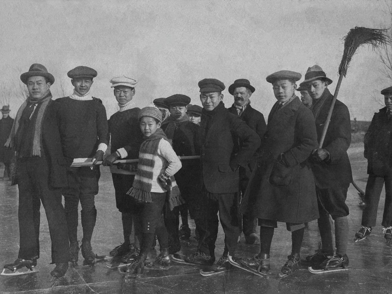 De zoons van de familie Njiokiktjien en hun neven van de familie Ongkiehong, op de schaats in Den Haag, omstreeks 1915.