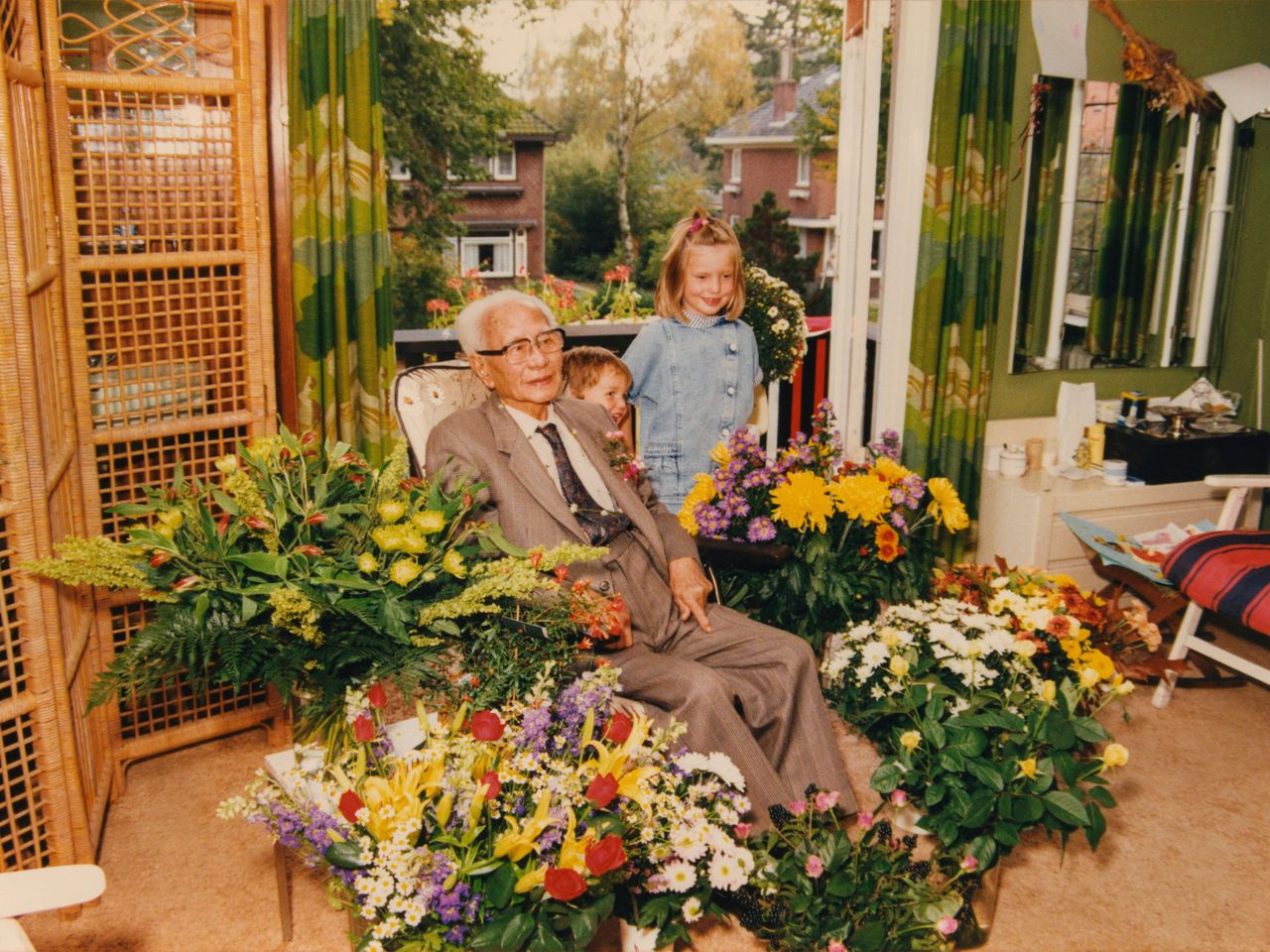 Opa Louis Njiokiktjien met zijn kleinkinderen Ilvy en haar broertje Esli. Op de 88ste verjaardag van opa.