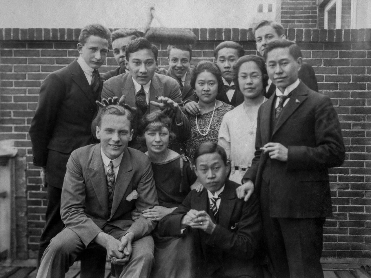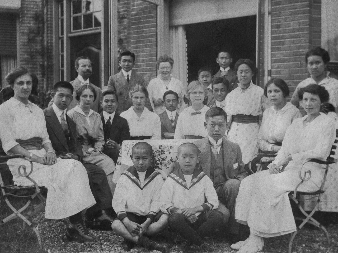 De kinderen van de familie Njiokiktjien en van de familie Ongkiehong op een groepsfoto met hun pleegouders van de familie Von Bülow, in het huis aan de Laan van Meerdervoort in Den Haag.