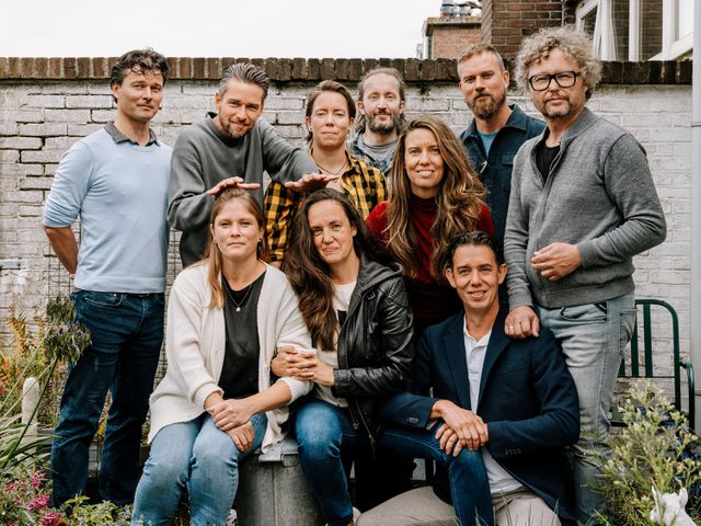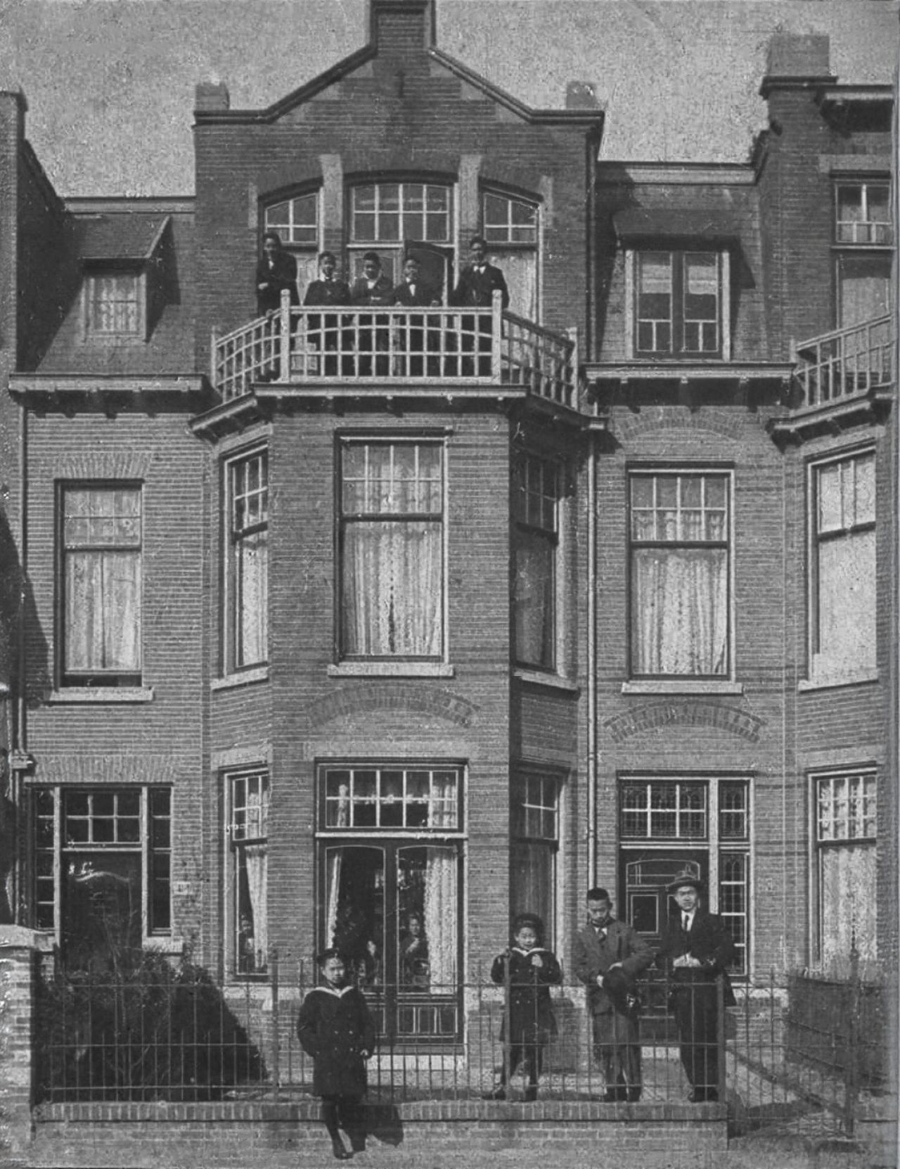 Met zussen, broer, neven en nicht op het balkon van het huis aan de Laan van Meerdervoort, Den Haag, waar exact honderd jaar eerder opa Louis (rechts in pak) stond met zijn zussen, broers, neven en nichten.
