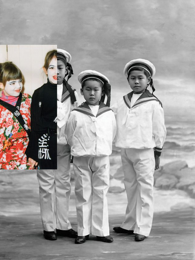 Zussen Aïsha (8) en Ilvy (5) Njiokiktjien tijdens carnaval in Maarssen in 1990. Broers Sander (12), Charles (8) en Louis (11) Njiokiktjien in 1913 in een fotostudio in Den Haag, een jaar na hun aankomst in Nederland.
