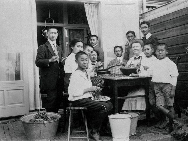 Bonen doppen in de tuin, omstreeks 1915, van het huis aan de Laan van Meerdervoort in Den Haag, waar de kinderen van de familie Njiokiktjien en de kinderen van de familie Ongkiehong samenwoonden bij pleegouders Von Bülow. Opa Louis staat rechts geleund tegen mevrouw Von Bülow.