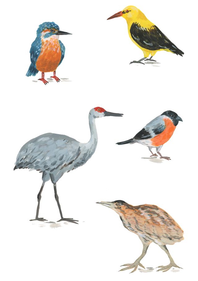 Van linksboven met de klok mee: ijsvogel, wielewaal, goudvink, roerdomp en kraanvogel.
