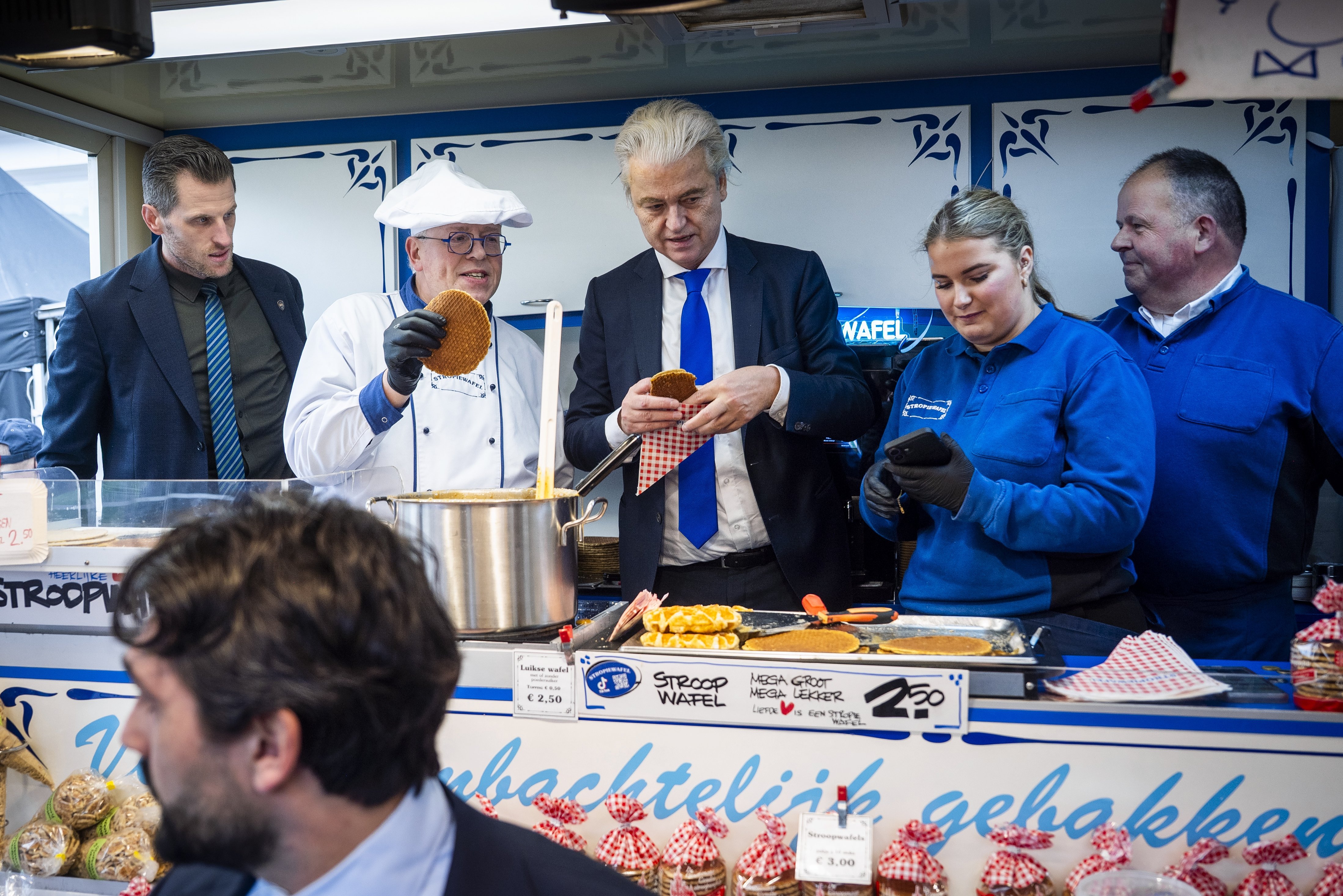 De bezoeken van Geert Wilders verlopen steeds volgens hetzelfde patroon: hij loopt door drukke winkels, er worden veel foto’s gemaakt, en soms eet Wilders kibbeling of een stroopwafel.
