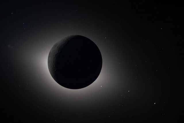 De maan blokkeert de zon volledig, wat de crew van Artemis II ervaart als een zonsverduistering. Aan de randen van de maan is de uitgestrekte corona van de zon te zien.