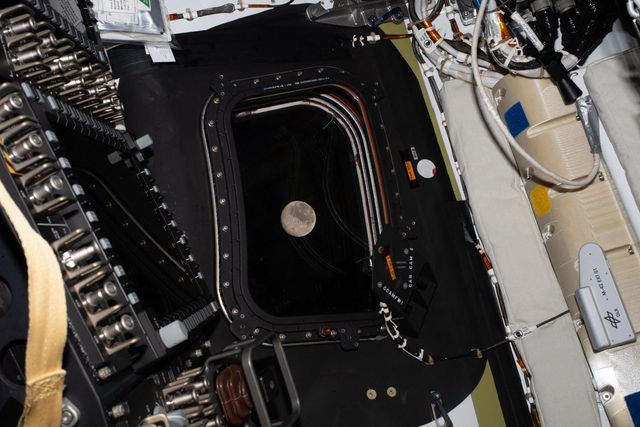 De aarde, gezien vanuit het raam van de Orion-capsule op 3 april 2026. De aarde wordt door de zon belicht, en is als een sikkel te zien.