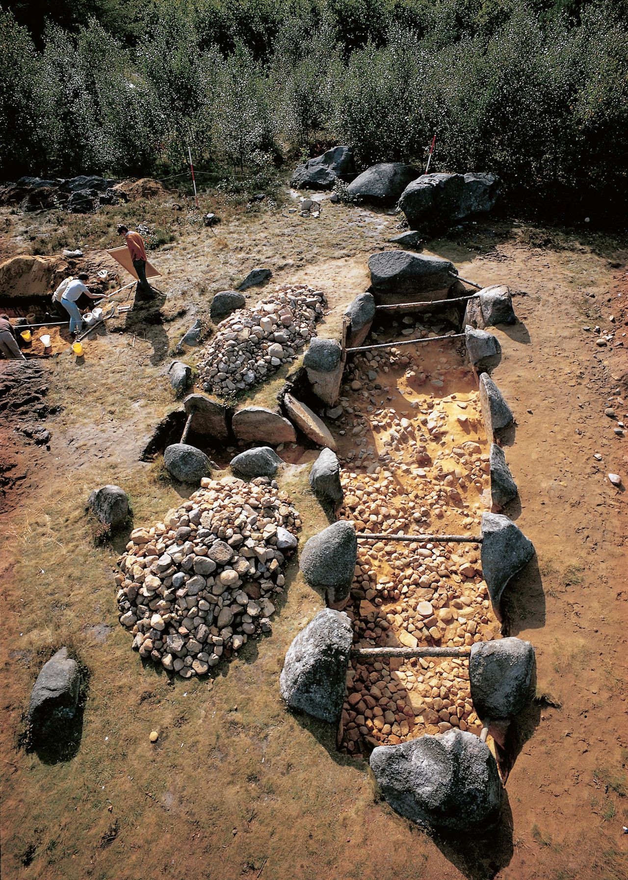 Het hunebed met verwijderde dekstenen. Met boomstammen worden vrijgegraven stenen gestut. Naast de poort liggen uit de kelder verwijderde veldkeien.