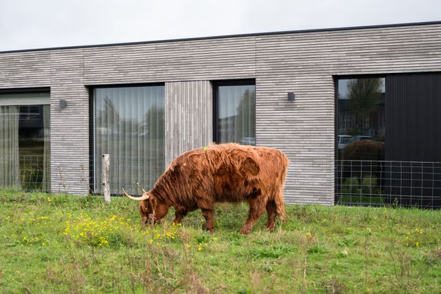 Een Schotse Hooglander graast voor een woning Tilburg.