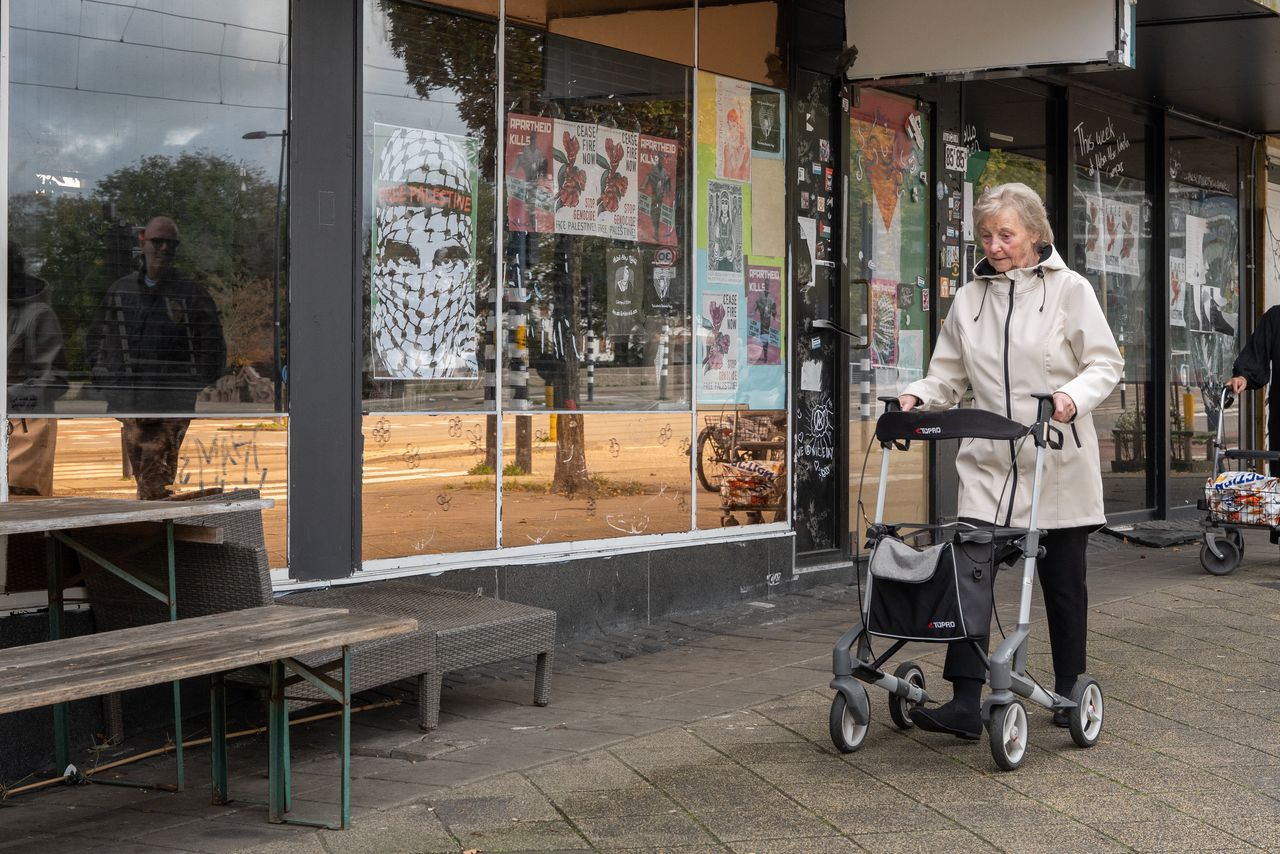 Het winkelcentrum op het Osdorpplein in Amsterdam; vrouw met rollator loopt langs Palestina-posters.