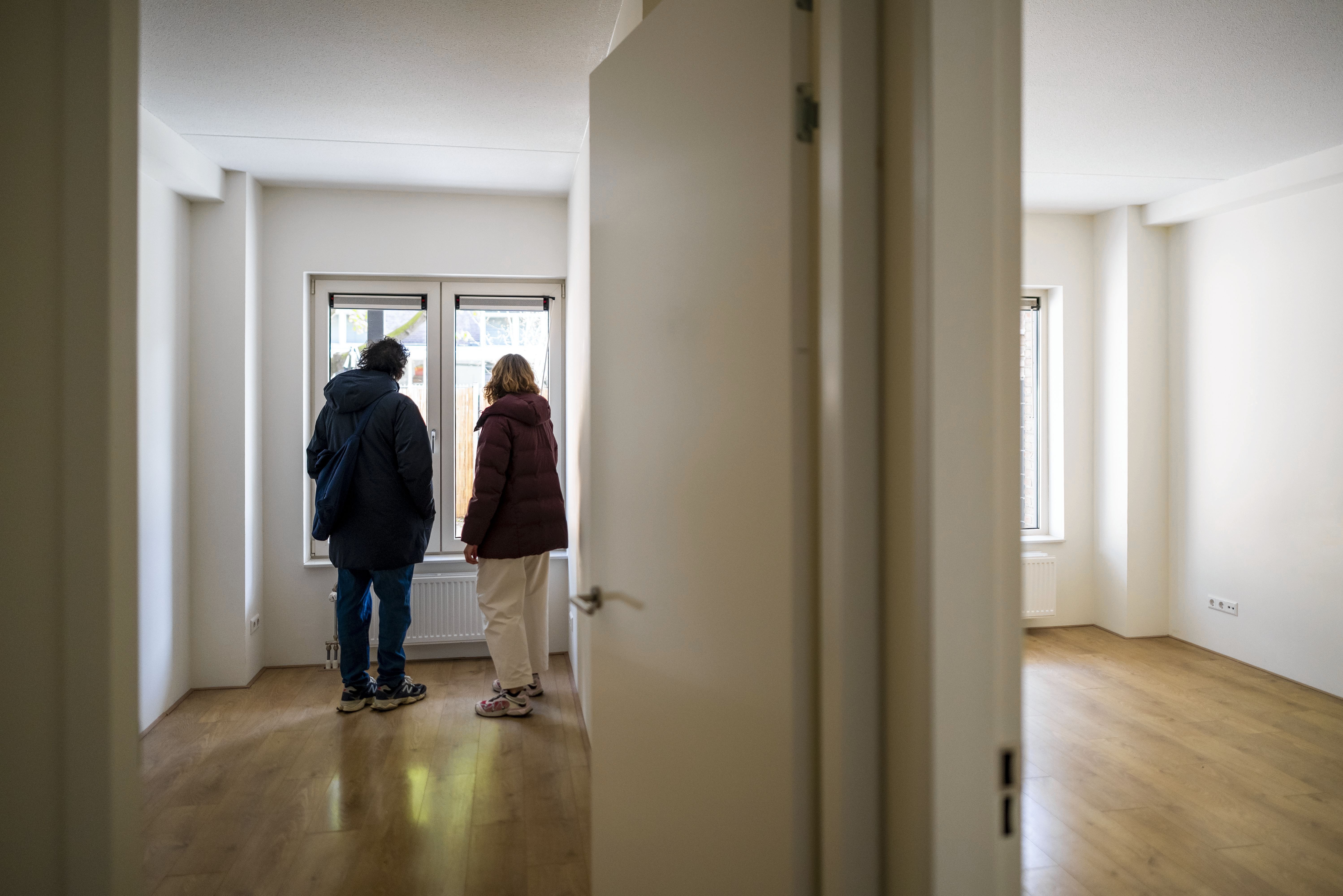 Sabina Kurlit en Maciej Nawrocki (beiden 28) komen het bezichtigen tijdens de Open Huizendag van makelaarsvereniging NVM, deze zaterdag. Sinds de Amerikaans-Israëlische aanval op Iran, nu vier weken geleden, is de hypotheekrente gestegen met zo’n 0,3 procentpunt. Op een hypotheek waarbij de rente voor tien jaar vaststaat, betaal je nu gemiddeld krap 4 procent rente.