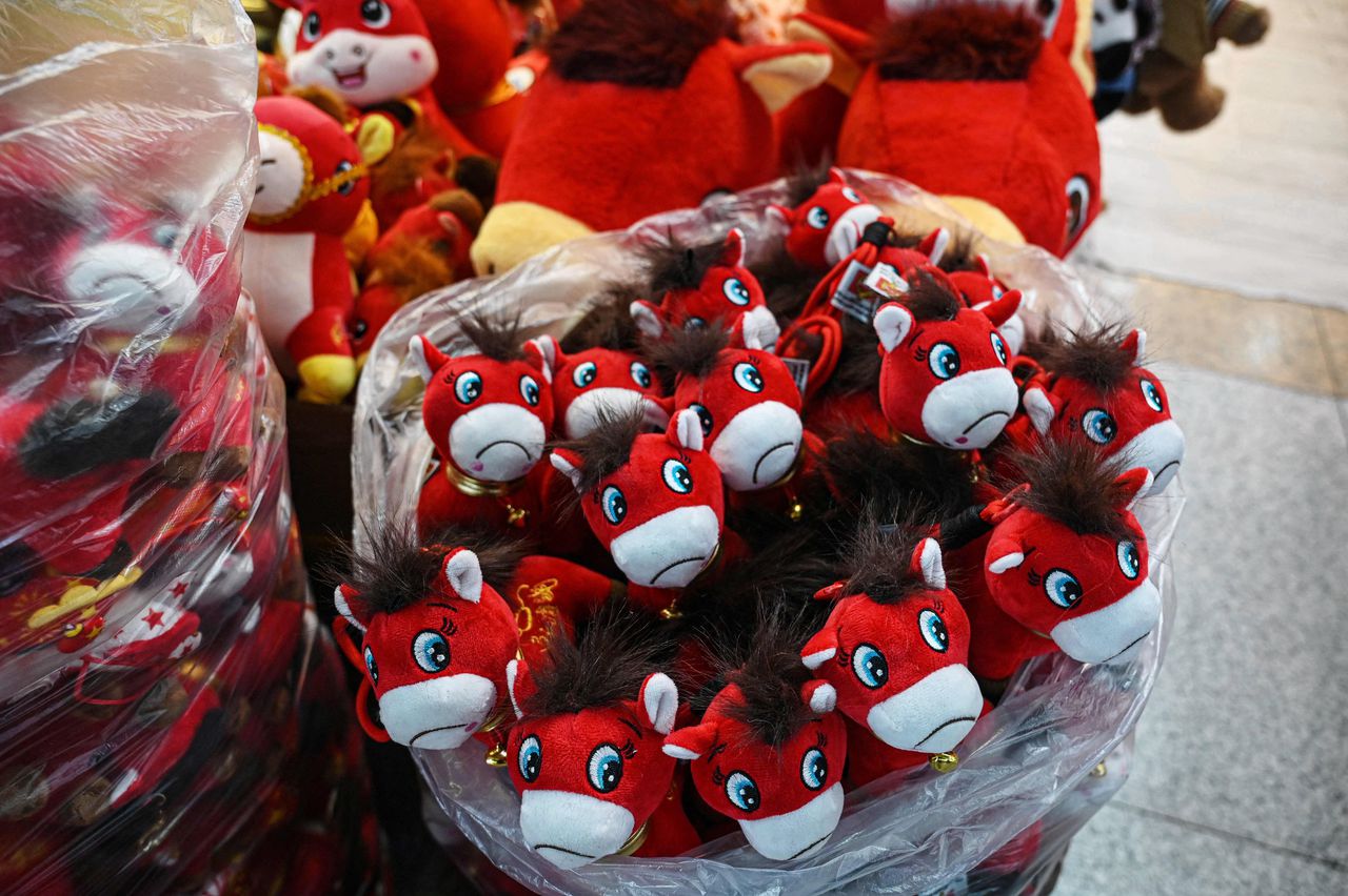 In een groothandel in Yiwu zijn sip kijkende nieuwjaarspaarden te koop. Het ging oorspronkelijk om een productiefout, maar inmiddels heeft de fabriek extra capaciteit ingezet om aan de vraag naar „het huilende paard” te voldoen.