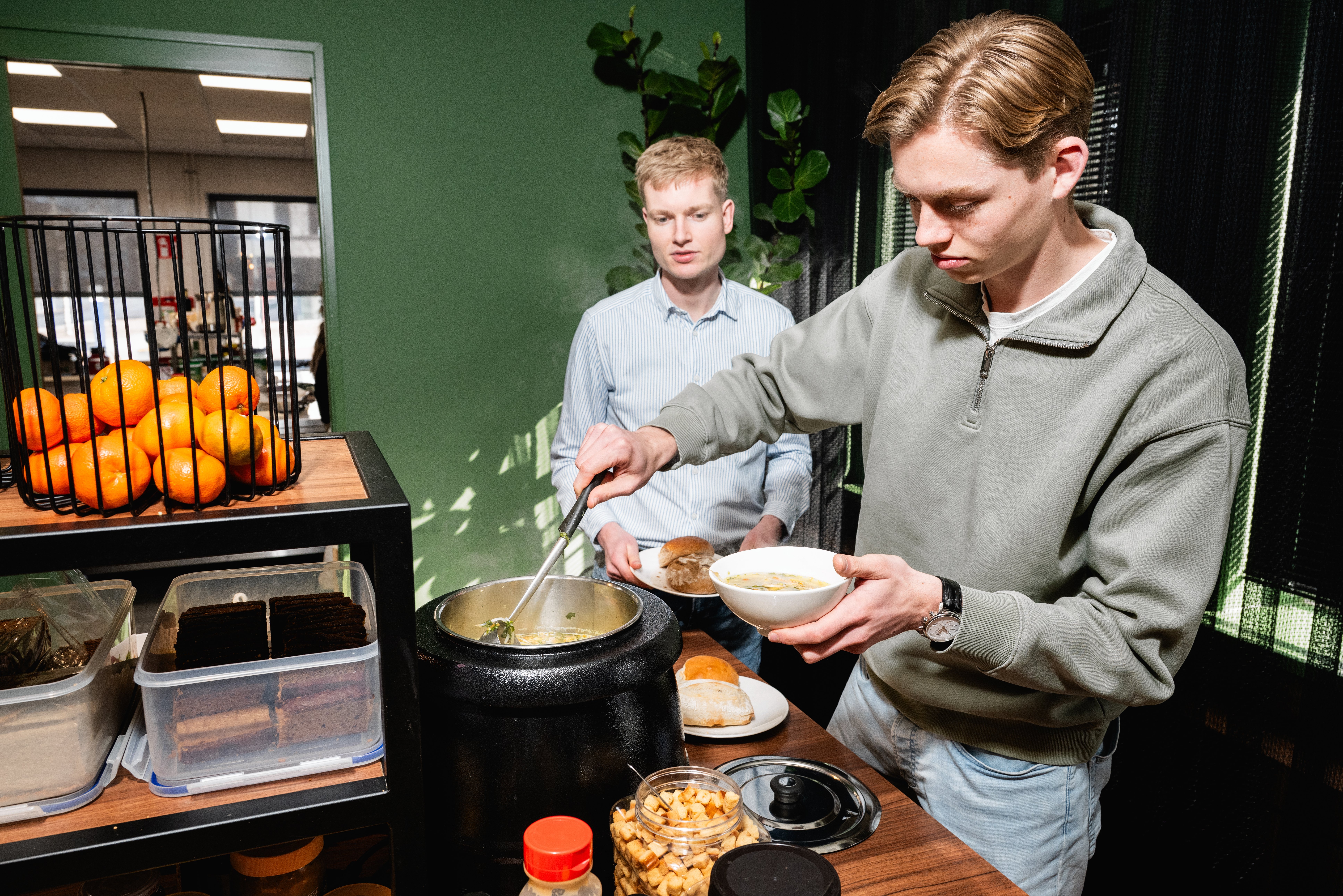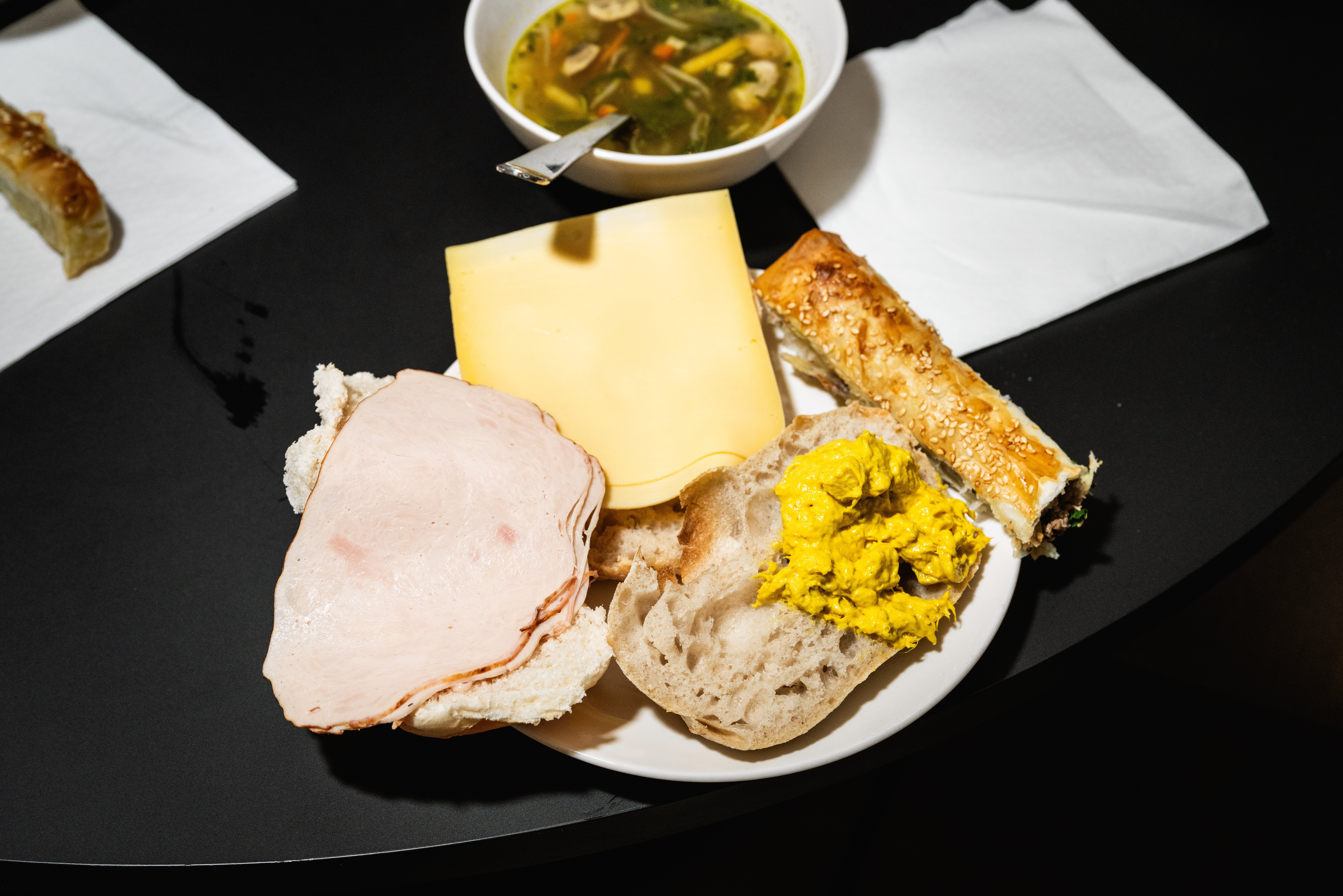 Op het bord van Gerwin ligt een vleesbörek onder een servet verstopt. Hij had per ongeluk een spinazibörek gepakt maar hij wilde vlees. Gerwin: „Je mag eigenlijk maar ééntje van alles, anders krijg je een mailtje van facility. Daarom heb ik ‘m verstopt.” Rik pakt zijn telefoon erbij, hij wil mij alle mailtjes van facility laten zien.