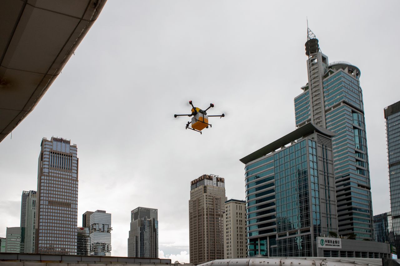 In Talent Park, in de Chinese stad Shenzhen, heeft een bezorgdrone net een bestelling afgeleverd op de ‘bestel- en bezorgkiosk’ van Meituan. De drone vliegt weer terug naar zijn basis, een vliegveldje op het dak van een groot winkelcentrum in de stad.