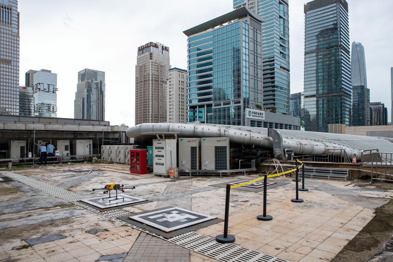 In een hoekje op de vijfde verdieping van het winkelcentrum Coco Park in het Futian district leidt een vies en donker trappenhuis naar een dronevliegveldje. Tussen de airconditioningunits in, op het platte dak van het gebouw, liggen vijf landingsplatforms, die doen denken aan vergrote QR-codes. Op een van de vierkanten plakkaten staat een net teruggekeerde drone waarvan de propellers langzaam tot stilstand komen.