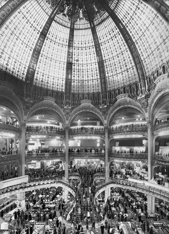 Galeries Lafayette in Parijs, begin 20ste eeuw, mét trap. Die werd in 1974 gesloopt omdat er meer winkelruimte moest komen.