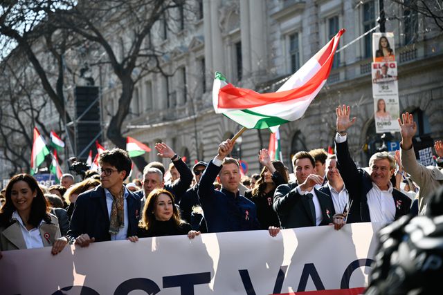 In zijn toespraak op het Heldenplein, aan de voet van het Millenniummonument, bevestigt Magyar aan het einde van de middag de verwachtingen van zijn kiezers. Hij zal veel geld vrijmaken voor zorg en onderwijs, belooft hij, en de banden met de EU aanhalen. „Ons land maakt deel uit van het Westen, de Europese gemeenschap en de NAVO.” Hij verwijt Orbán, die juist hamert op de Hongaarse soevereiniteit, dat hij Russische inlichtingendiensten inzet tegen Hongaarse burgers. Recent duiken meer bewijzen op voor Russische inmenging in de Hongaarse verkiezingen, via desinformatie op sociale media.
