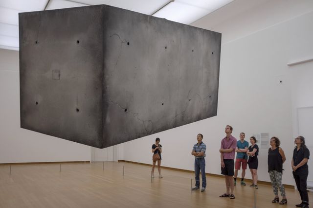 Bezoekers kijken naar een zwevend blok beton van Studio Drift in mei 2018 in het Stedelijk Museum in Amsterdam.