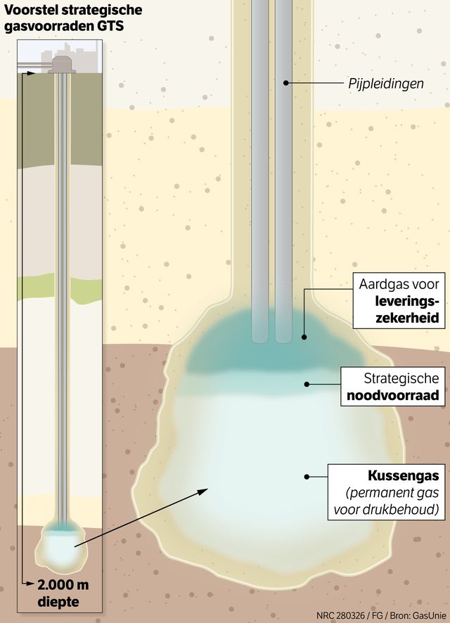 Dit soort langetermijnvoorraden zouden bovenop de ‘normale’ winteropslagen komen die Nederland al heeft. Die ligt verspreid over vier grote en twee kleine holtes onder de grond op ruim een kilometer diepte.