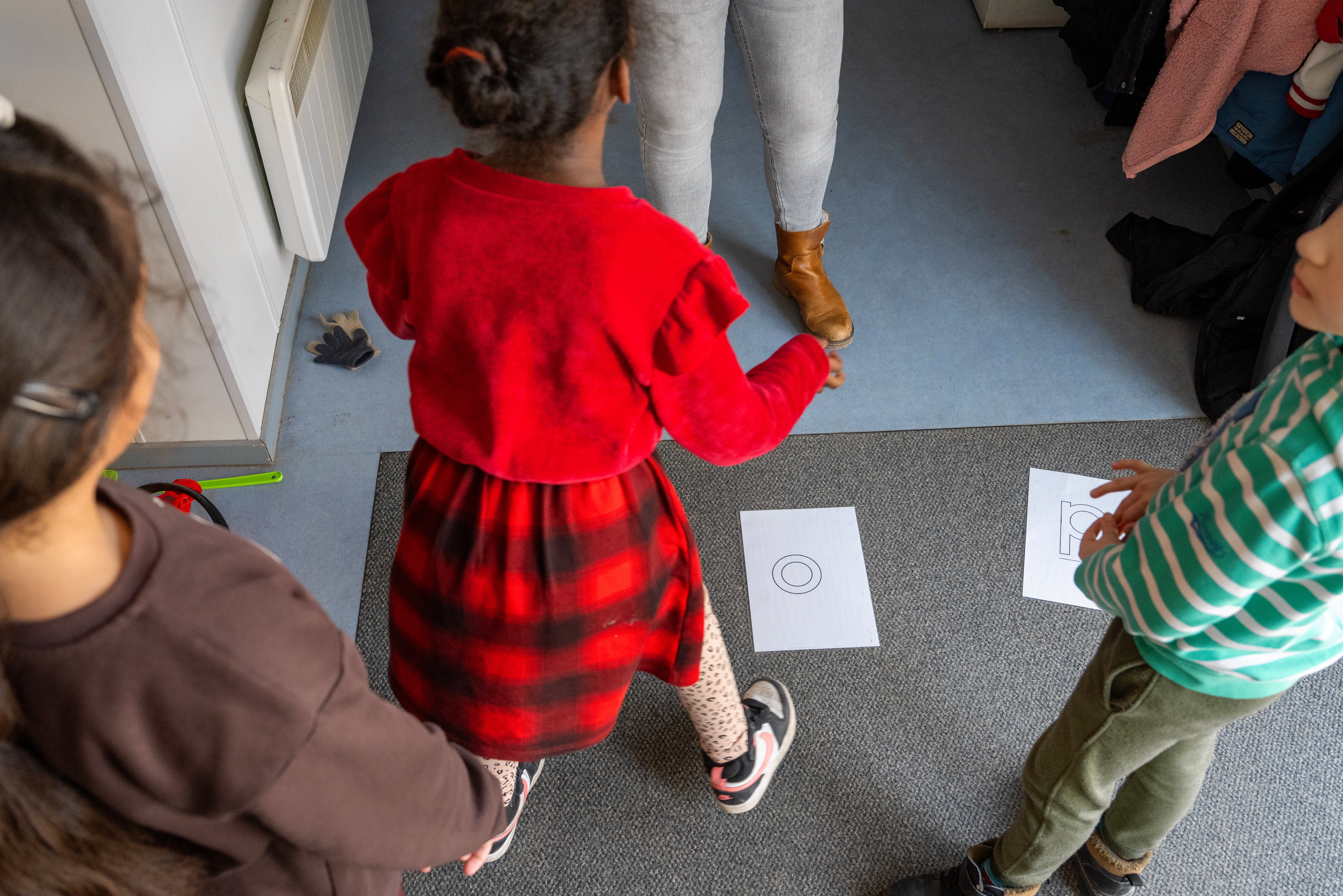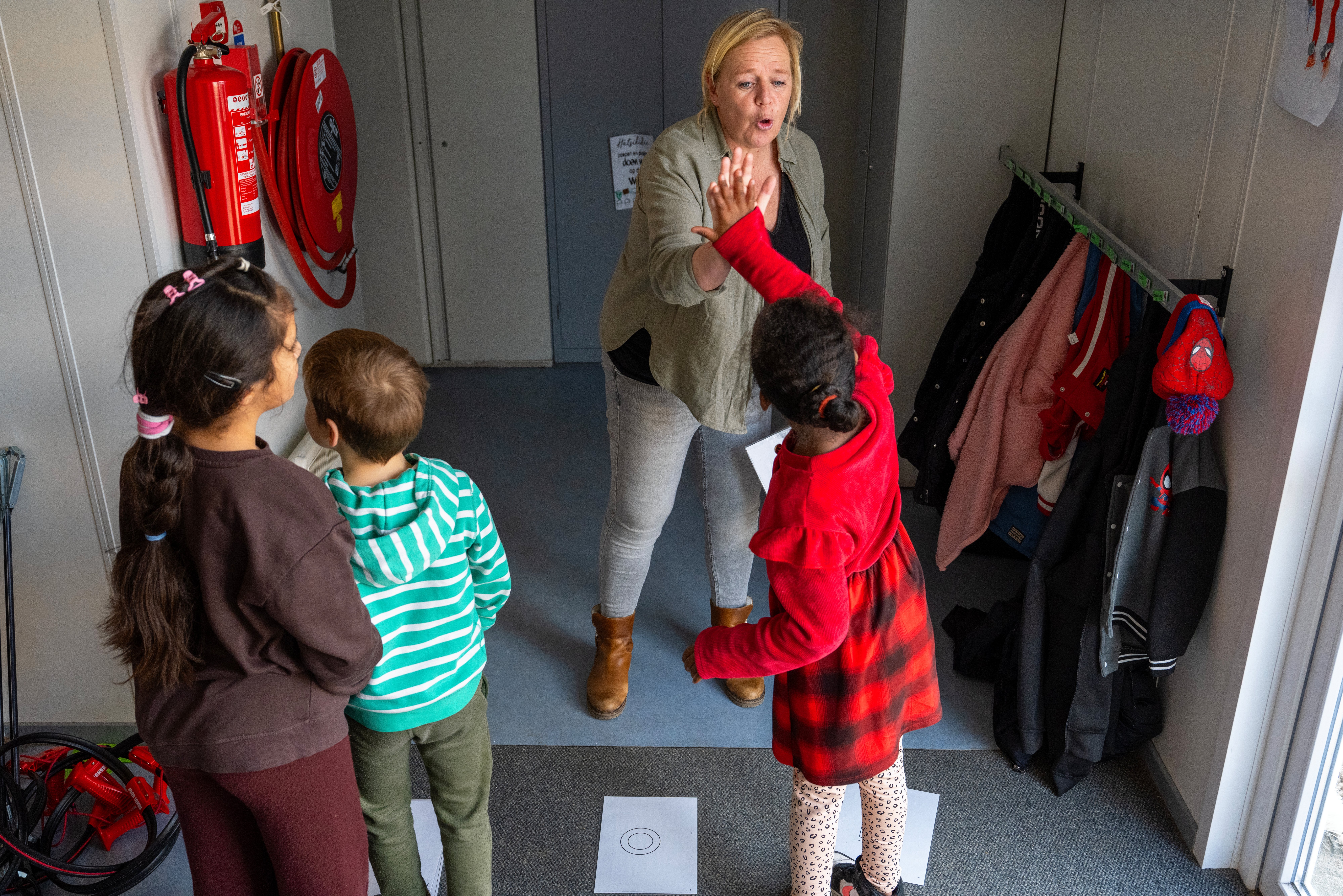 Onderwijsassistent Sonja Trommel laat zien hoe dat gaat. In de gang bij haar lokaal legt ze geplastificeerde A4’tjes neer met op elk vel een letter: K-A-M. Ze gaat bij de K staan en klapt in haar handen. „K”, zegt ze. Dan springt ze naar de A en klapt weer in haar handen. „A”, zegt ze. Hetzelfde doet ze met de M. Dan brengt ze haar handen boven haar hoofd bij elkaar en zegt „kam”. De leerlingen moeten dit nadoen. Zo leren ze dat je van losse letters woorden kunt bouwen.