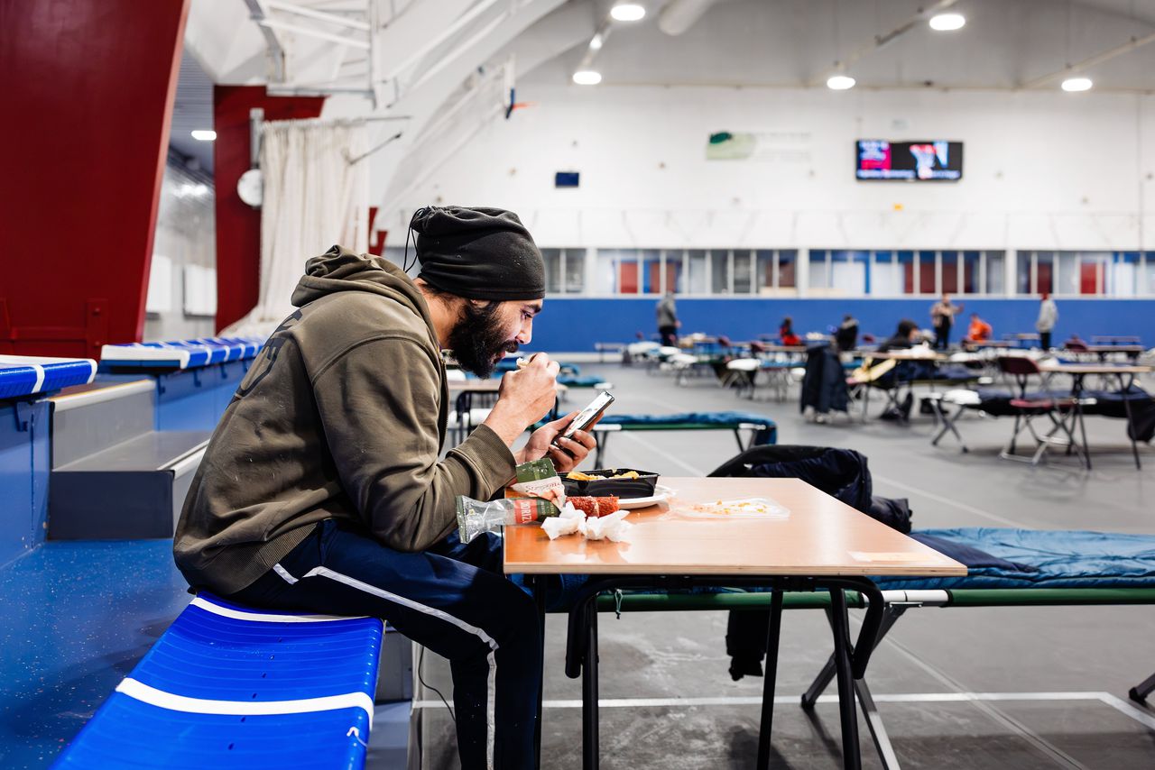 Vrijdagavond staan locatiemanager Janneke van Loo en haar collega’s nog meer veldbedjes op te zetten. „Het is een soort babygiraffe”, zegt ze. „Eerst is het net een stapeltje poten, maar als-ie staat, lijkt het ineens ergens op.” Er zijn al tientallen mannen binnen – voor vrouwen, een minderheid, is een aparte locatie. Er staan maaltijden klaar in magnetronbakjes, dozen verse oliebollen en er is koffie en thee.