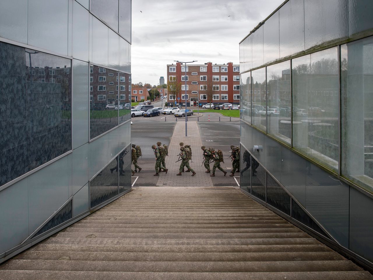 „Eén-twee-drie-vier. En één-twee-drie-vier”. Nog voor je ze ziet, hoor je ze: een groep van zo’n 25 jonge mannen die in legergroene uniformen komt aanmarcheren. Helemaal gelijk op gaat het niet, ondanks het gebrul van de sergeant die mee marcheert. Onder de jongemannen wordt zachtjes gelachen en gesmoesd, zeker als ze bekenden passeren die op bankjes buiten zitten met hun telefoon.