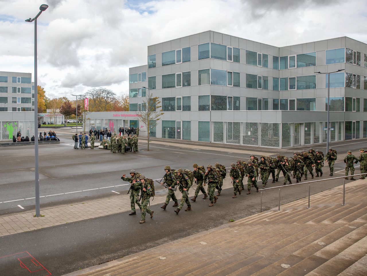 Het marcheren vindt plaats tussen schoolgebouwen op de campus van Zadkine. Helemaal gelijk op gaat het niet tijdens de training in Rotterdam, ondanks het gebrul van de sergeant die mee marcheert.