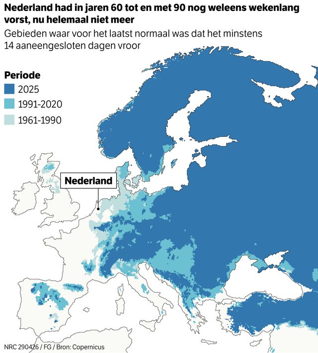 Tot 1990 daalde het kwik in Friesland, Groningen en grote delen van Oost-Nederland nog gemiddeld minstens veertien opeenvolgende dagen per winter onder nul. In de dertig jaar daarna was dat nergens in Nederland meer het geval. Afgelopen jaar kenden alleen Scandinavië, Midden- en Oost-Europa en een aantal hoger gelegen Europese gebieden veertien aaneengesloten vriesdagen.
