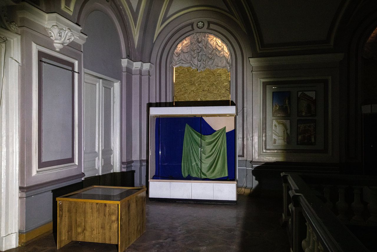 Zo eenzaam zonder zijn kunstvoorwerpen hoort een museum niet te zijn. Alleen een enkele tekening, beschrijving of landkaart is achtergebleven. Terwijl ze over de licht krakende visgraatvloer loopt, schijnt museumdirecteur Olha Hontsjarova mistroostig met een zaklamp op de ene na de andere lege vitrine. Op de minisokkels en doorzichtige legplanken ontbreken de kunstvoorwerpen.