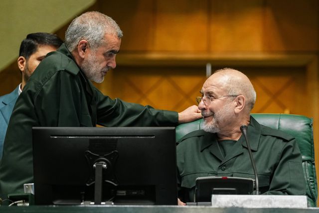 Parlementsvoorzitter Mohammad Bagher Ghalibaf (rechts) geldt als mogelijke rivaal van Khamenei’s vertrouweling Ali Larijani.