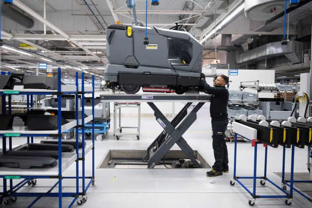 Een zit-schrobzuigmachine van Kärcher in de maak in Baden-Württemberg.