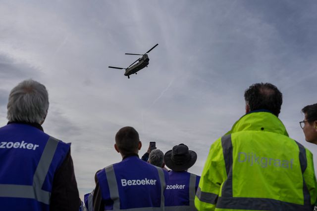 En ah, daar klinkt in de verte dan eindelijk het geronk van de Chinook. Cis Apeldoorn, voorbereid op alles, doet haar oordopjes alvast in.