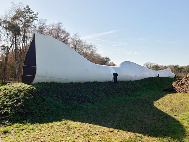 „Dit is dus de Blade Barrier”, zegt Thijs von Barnau Sythoff (27), terwijl hij in de modderige berm wijst naar de twee aaneengeschakelde wieken, samen zestig meter lang. „Een geluidsscherm van hergebruikte windturbinebladen.”