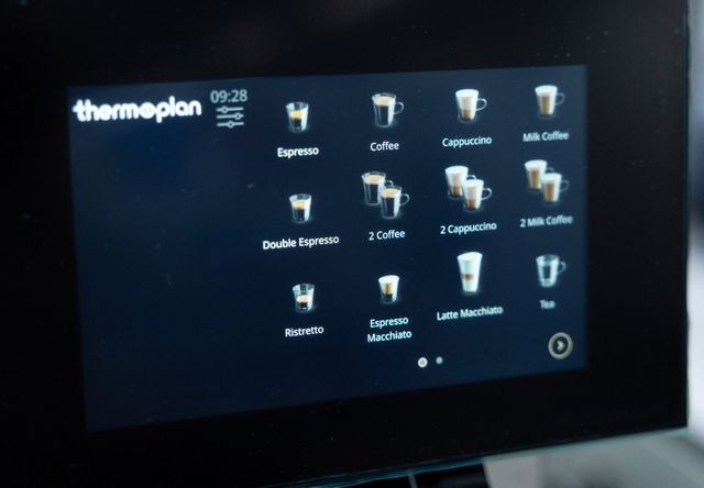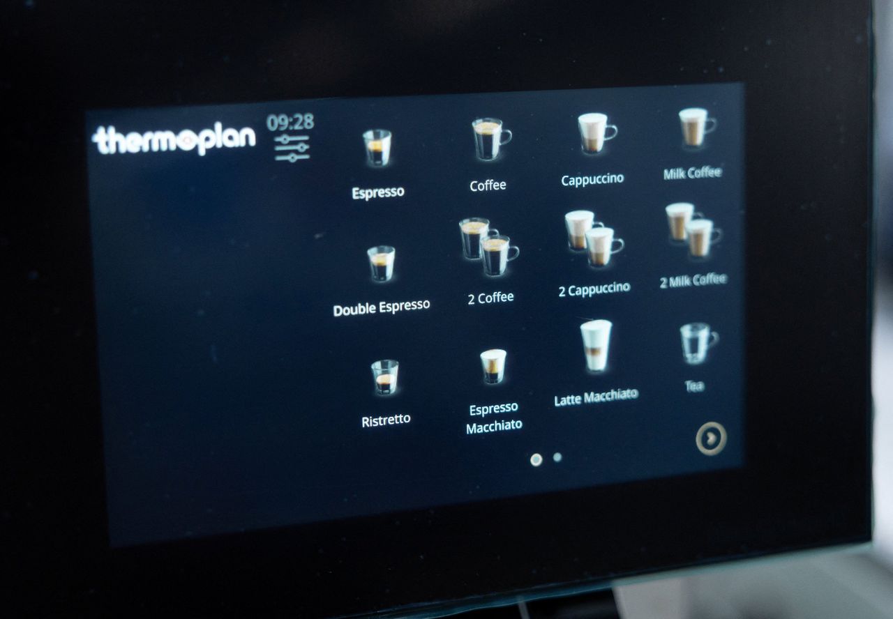 Een koffiemachine van Thermoplan die ook melk schuimt, tegenwoordig de standaard op kantoor.
