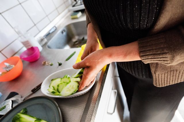 Najwa Alshaar snijdt komkommer in de keuken van Jeroen van der Woude.