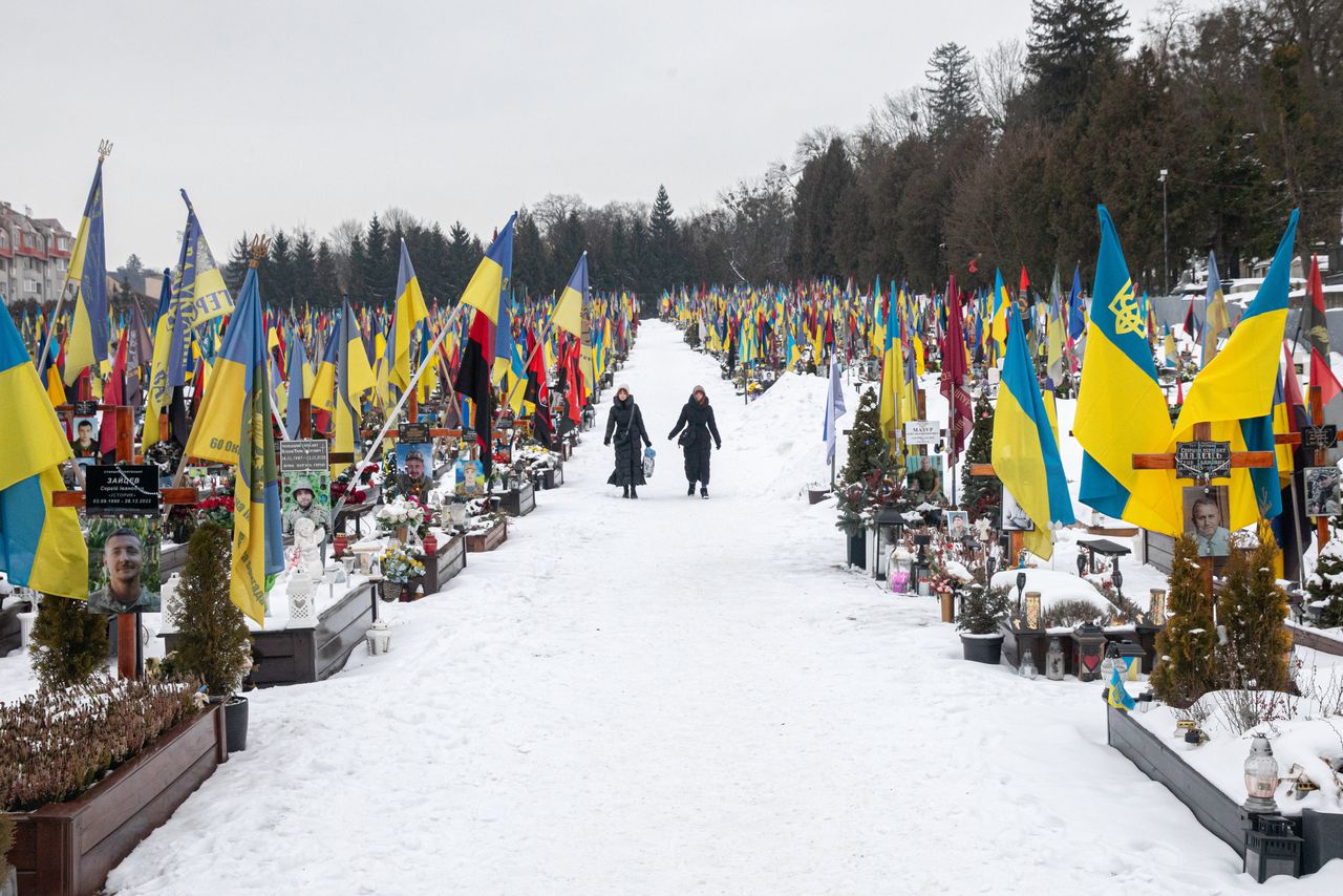 In de nabijgelegen garnizoenskerk worden de militairen rinkelend bewierookt voor hun laatste reis. Vier militairen en een vliegenier met de titel ‘held van Oekraïne’ zijn deze week uitgeleid. „Een piloot”, fluistert een vrouw op straat als de kist van die laatste voorbij wordt gereden. Voor het gemeentehuis houdt de lijkwagen halt. Medewerkers staan voor de ingang. Er klinkt een trompetserenade. Tientallen voorbijgangers op het drukke plein houden halt en slaan kruizen. Sommigen zakken op één knie. Een vrouw huilt.