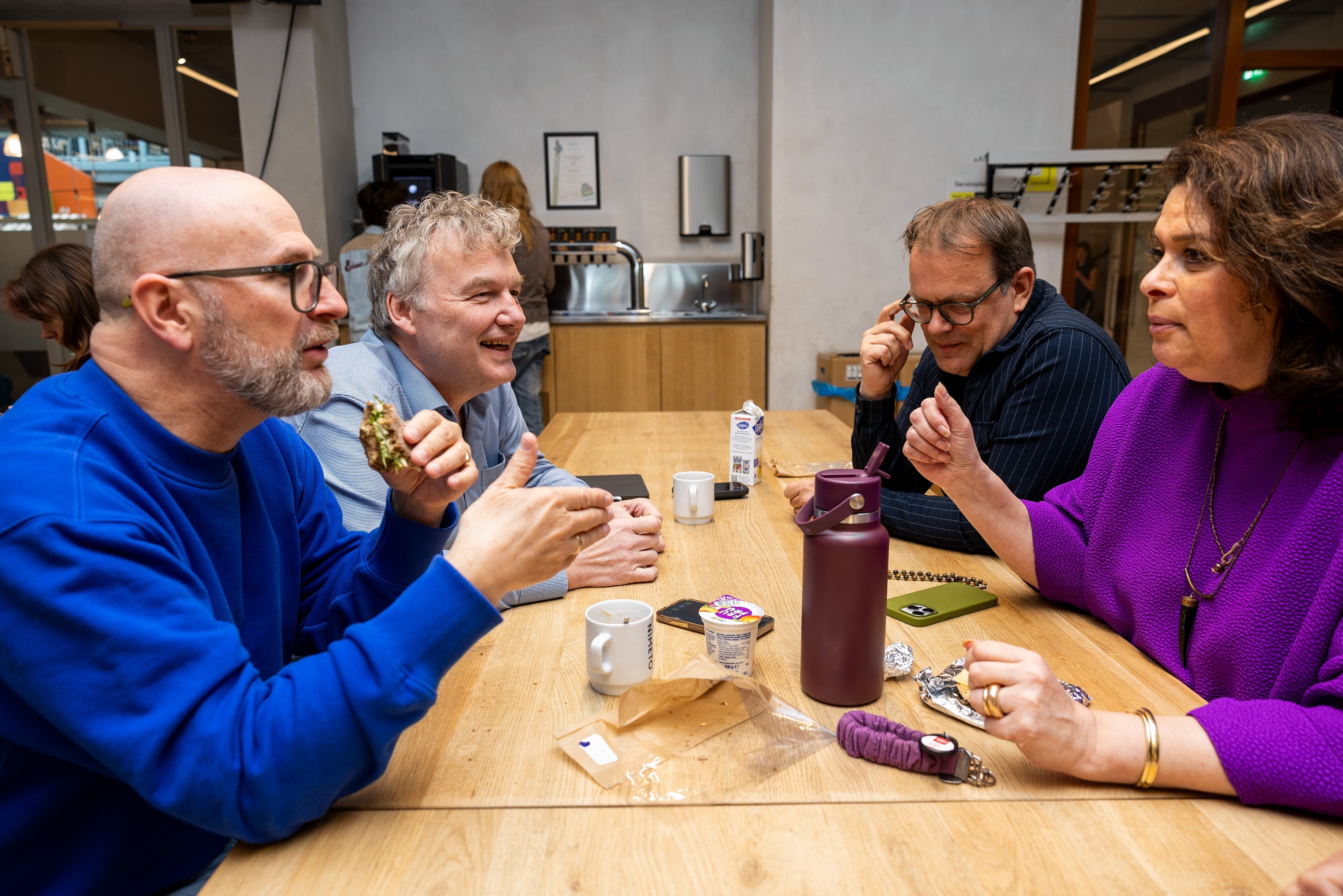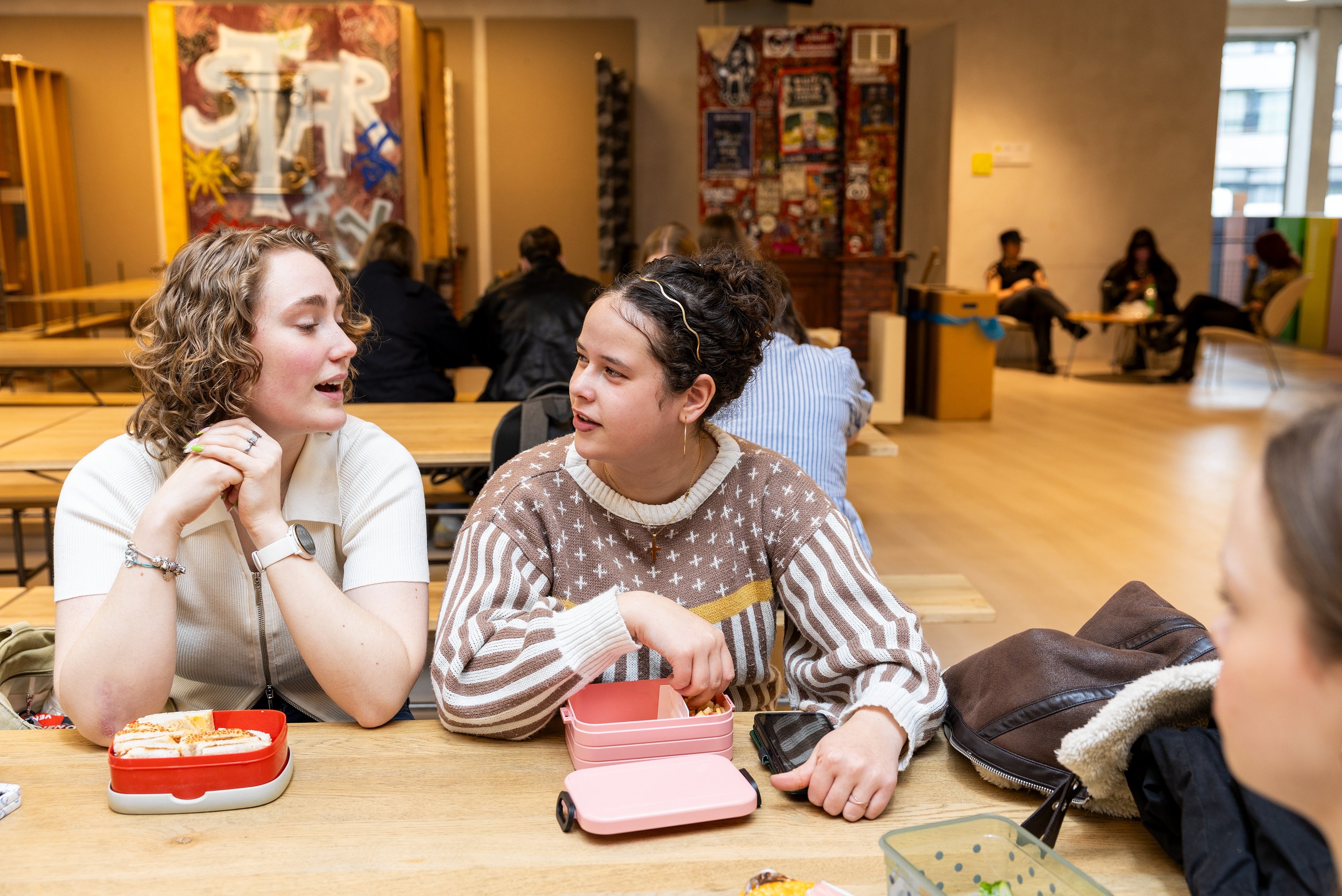 „Iedereen hier zit gewoon door elkaar, studenten, docenten. De kantine is echt de centrale ontmoetingsplek van de school”, zegt Lauren. We lunchen vandaag mee met Lauren en de algemeen bestuurder van de school: Henk. We mogen ook alle studenten aanspreken. Volgens Lauren is de school „heel open”. Bestuurder Henk heeft zelfs vorig jaar zijn kantoor opgegeven, hij vergadert meestal in de kantine. Gewoon tussen de studenten: „Henk is een hele vrije man”.