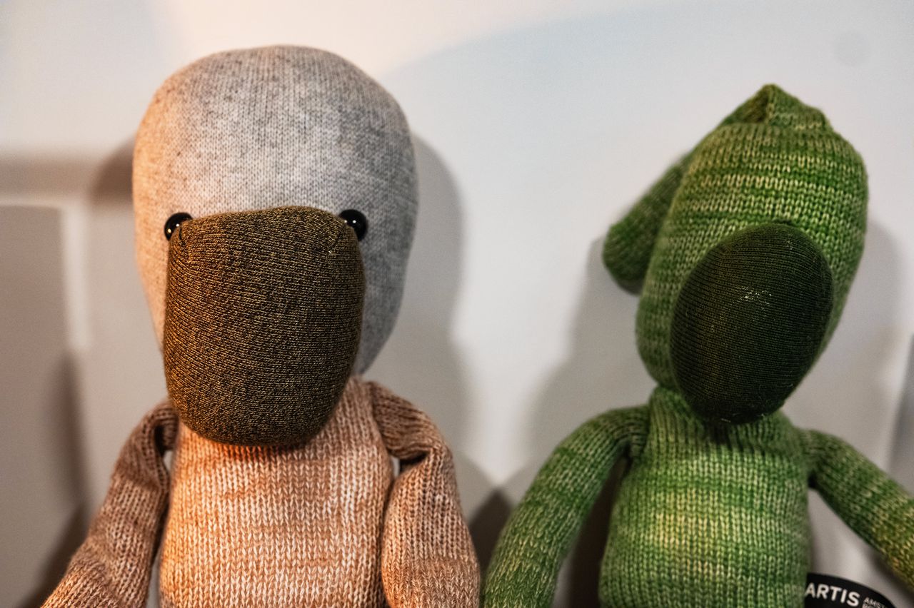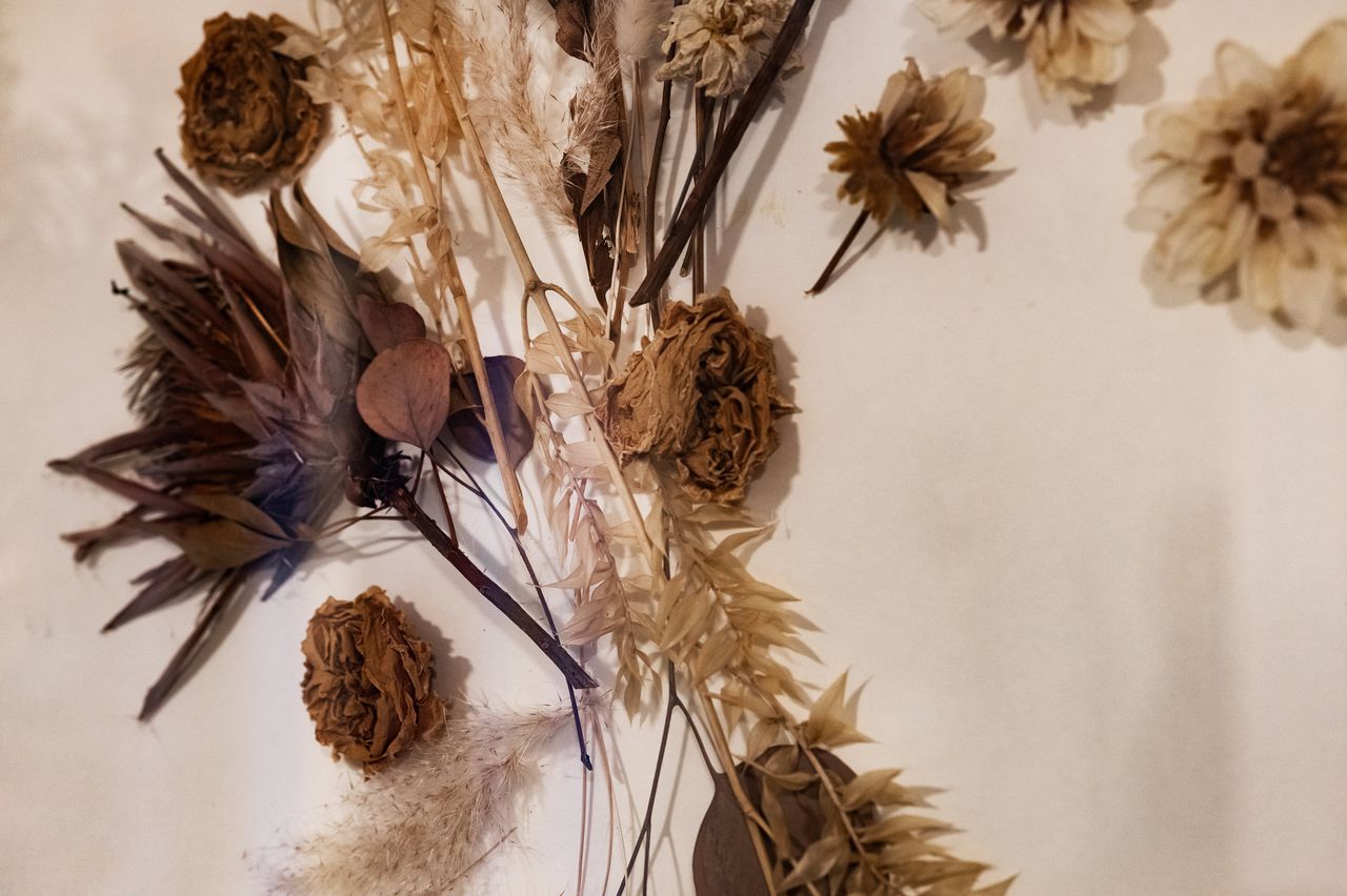 Links: het gedroogde bruidsboeket hangt bij Sandra en Lars thuis aan de muur. Rechts: knuffels uit Artis in Amsterdam, waar ze jarenlang vlakbij woonden.