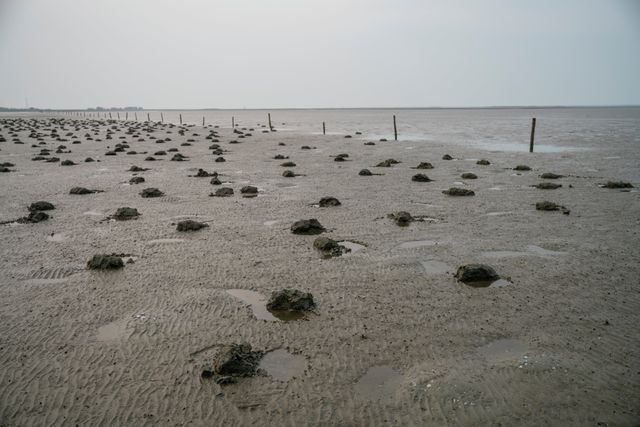 Een half uur verderop, bij de schelpdierkwekerij, zijn wat meer vogels te zien. Een bewaker rijdt op een zware brommer rondjes over het gebied. Alleen aan de andere kant van de stokken die de kwekerij afbakenen van de rest van het wad hebben bewoners van aangrenzende dorpen die dag gegraven naar schelpdieren. Het publieke gedeelte van het wad ligt er als een veld vol molshopen bij.