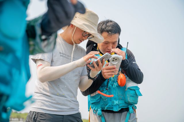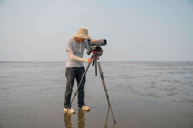 Op het kilometerslange getijdengebied zijn dan al veel mensen actief. Hoe verder richting de horizon, hoe meer het er lijken te zijn. Dit is een van de locaties waarop je „meer mensen dan vogels” kunt aantreffen, lacht teamlid Liu Zhuo. Ze volgt een kaartje op haar telefoon waarop het strand in blokken is verdeeld. Op de grens tussen verschillende blokken markeert ze een plek waar vanuit ze door een verrekijker op statief in vier richtingen kijkt en alle vogels en mensen telt die ze kan zien.