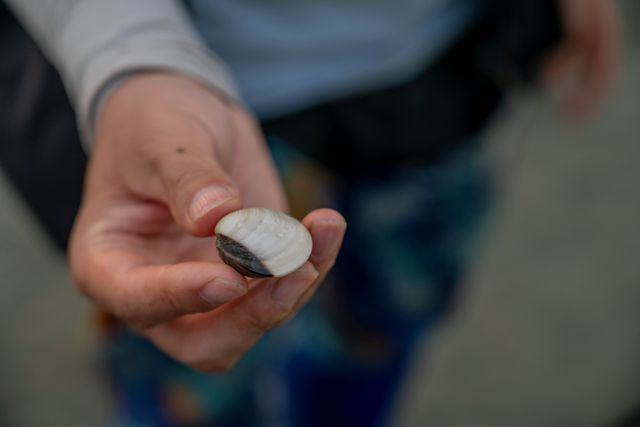 Trekvogelonderzoeker He-Bo Peng laat een tweekleppig schelpdier zien dat op het wad is achtergebleven na de oogst.
