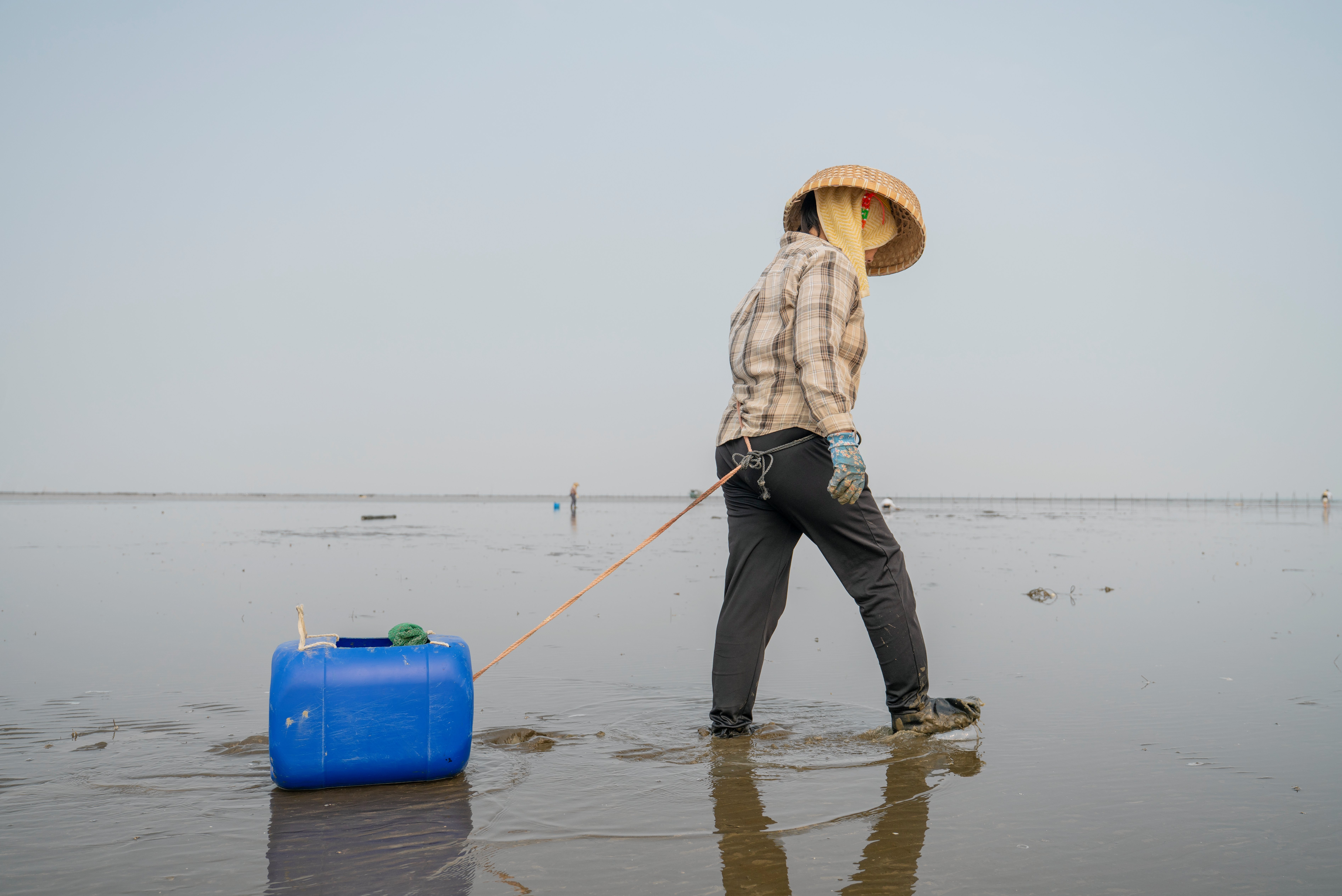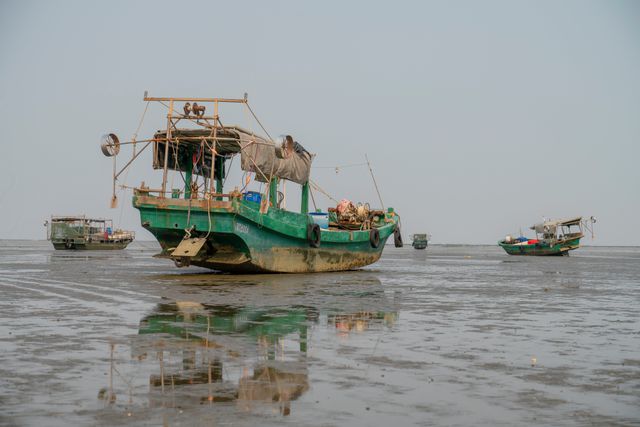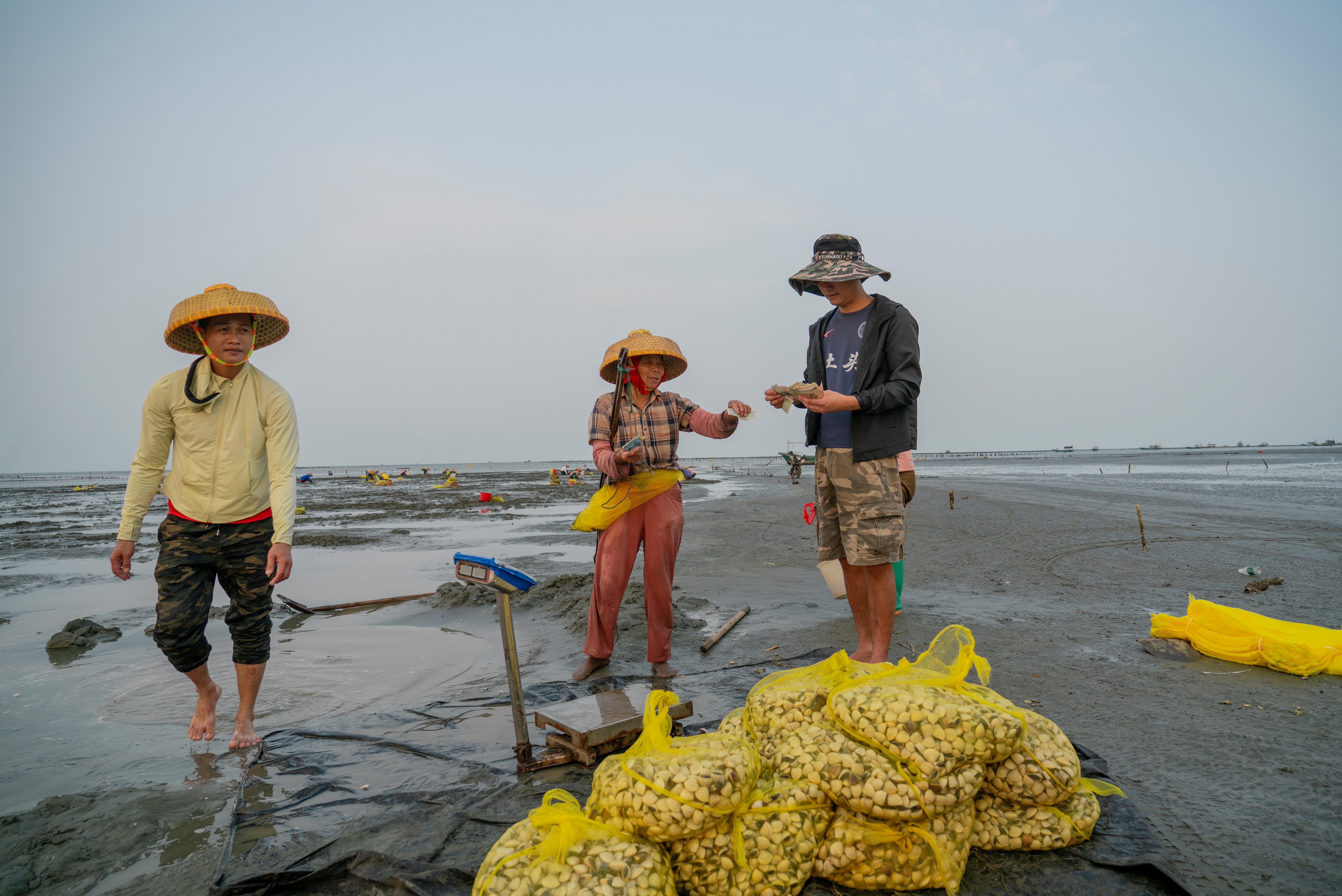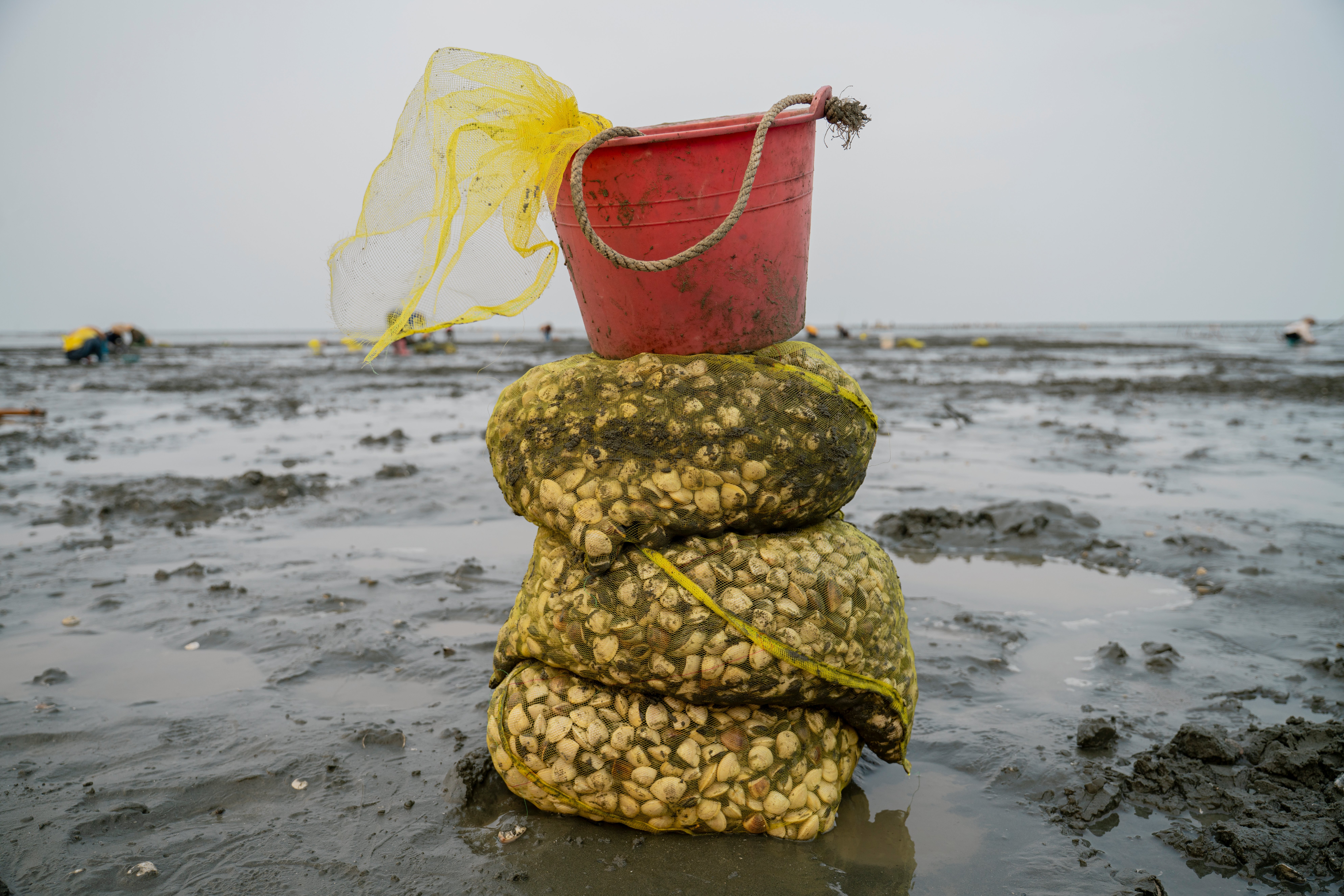 In de namiddag glinstert het wad van het Zuid-Chinese Leizhou in de zon. Het is eb. In de voor het oog eindeloze moddervlakte krioelen kleine krabjes en liggen vissersboten. Verderop zijn tientallen mensen bezig met het oogsten van schelpdieren die hier zijn gekweekt. Ze graven ze met de hand uit en verzamelen ze in gele netten. Stokken geven de omheining aan van deze schelpdierkwekerij, die zich bevindt in een getijdengebied en elke dag ongeveer de helft van de tijd onder water ligt.