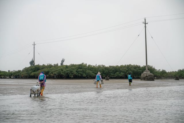 Aan het einde van de dag, als het water langzaam begint te stijgen, ziet het strand bij Beihai er omgeploegd uit. Met volle emmers lopen omwonenden en bezoekers naar de mangrovestruiken aan de rand van het wad, op weg naar de parkeerplaats.