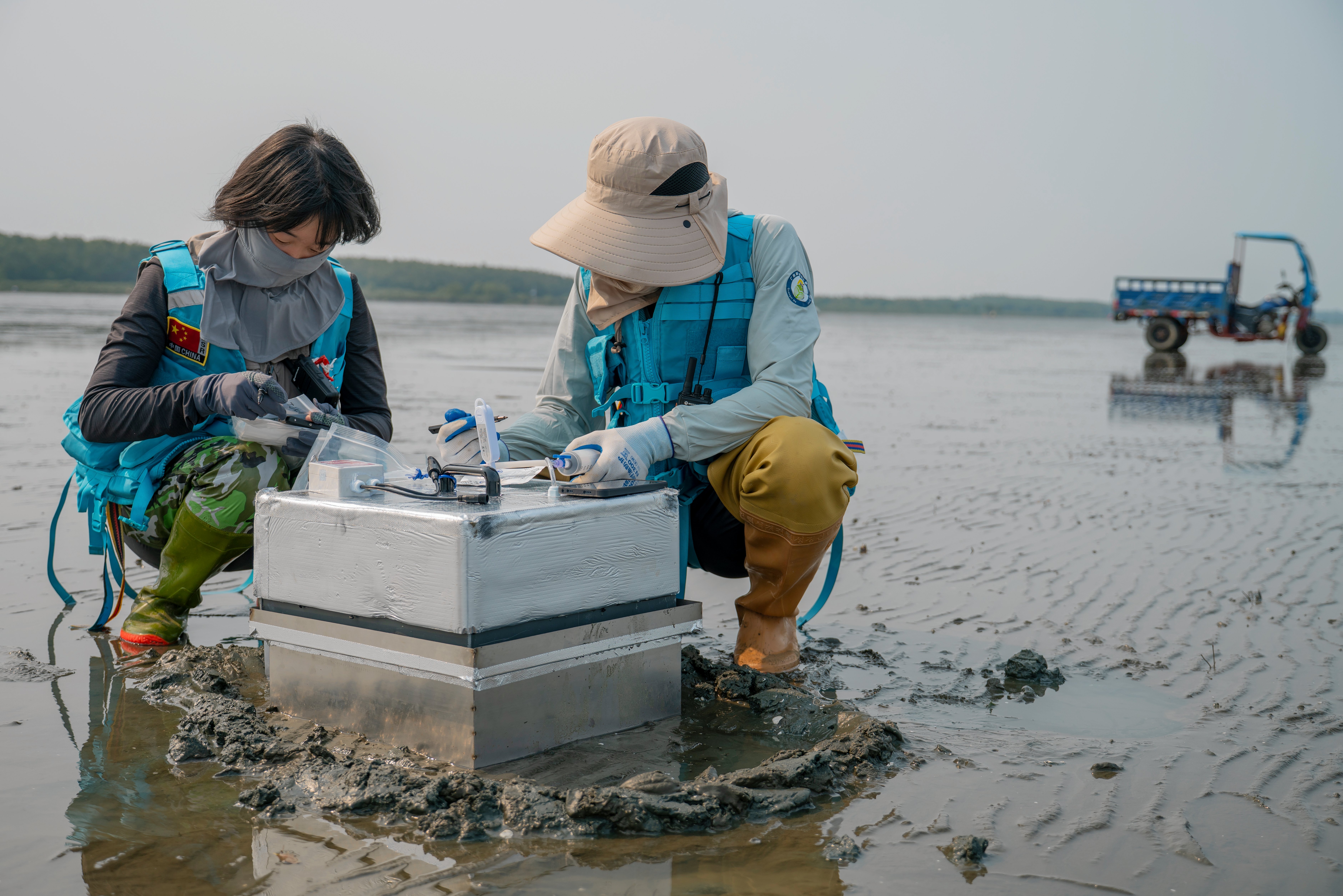 Het team van He-Bo Peng aan het werk op het wad.